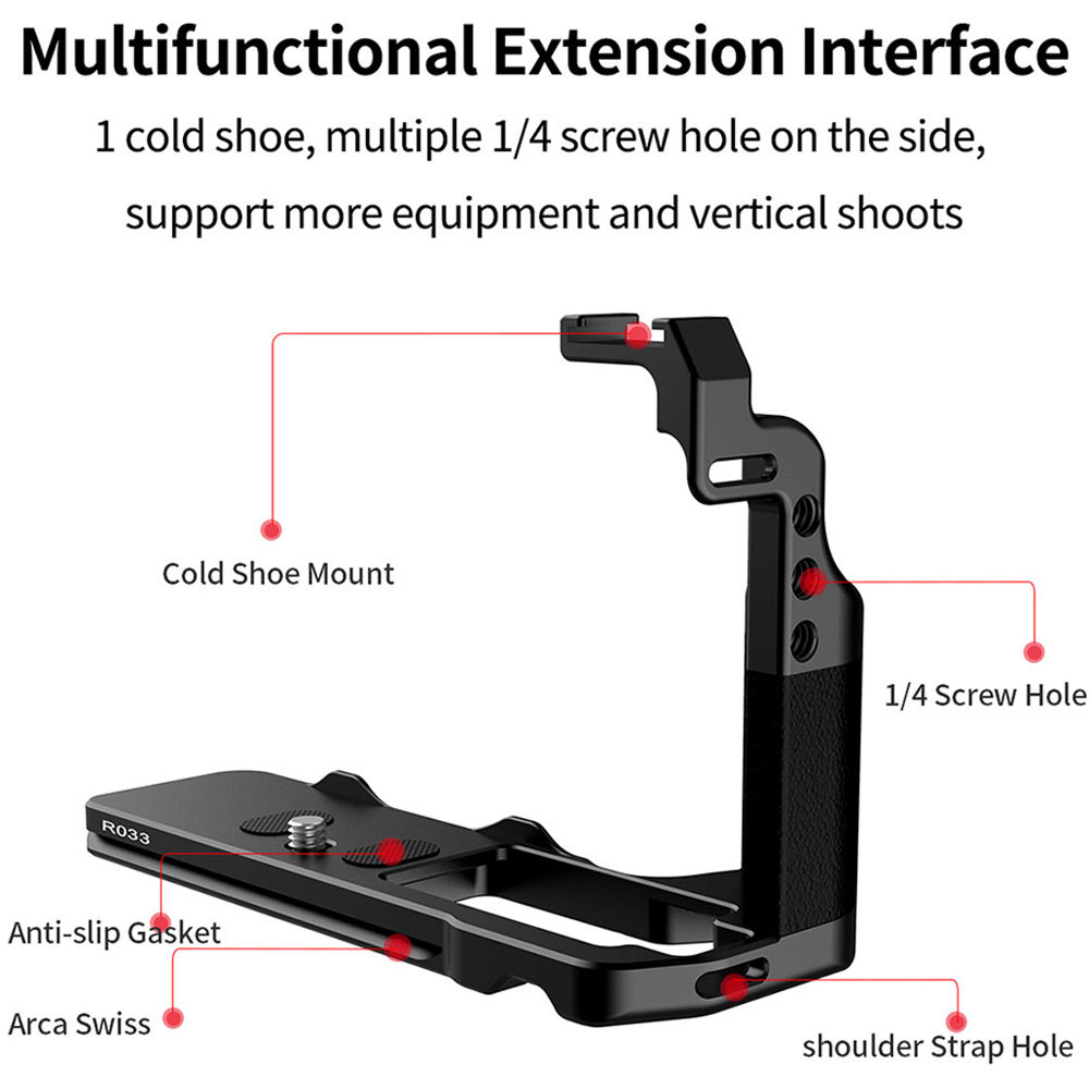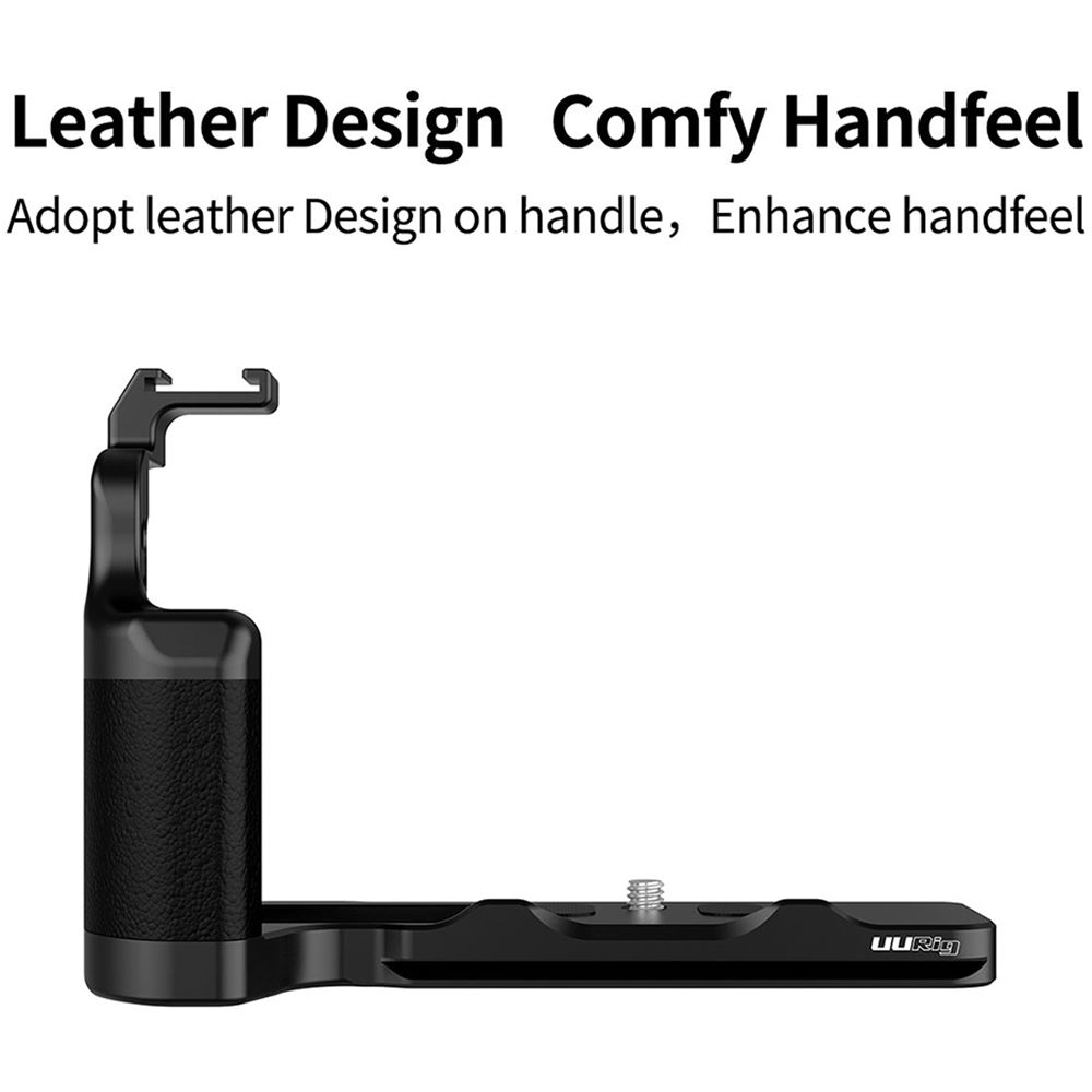 The durable Metal L-Plate for FUJIFILM X-T4 from UURig is a machined aluminum camera grip with an integrated Arca-style dovetail for quickly mounting into a compatible style receiver. The plate's machined areas allow full access to the camera's side ports and battery compartment, with a cutout allowing a power supply cable access to the battery door. The anti-twist lips and rubber traction pads secure the camera body in place and prevent unwanted movement. The hand grip features a leather-like design for comfortable grip and traction.