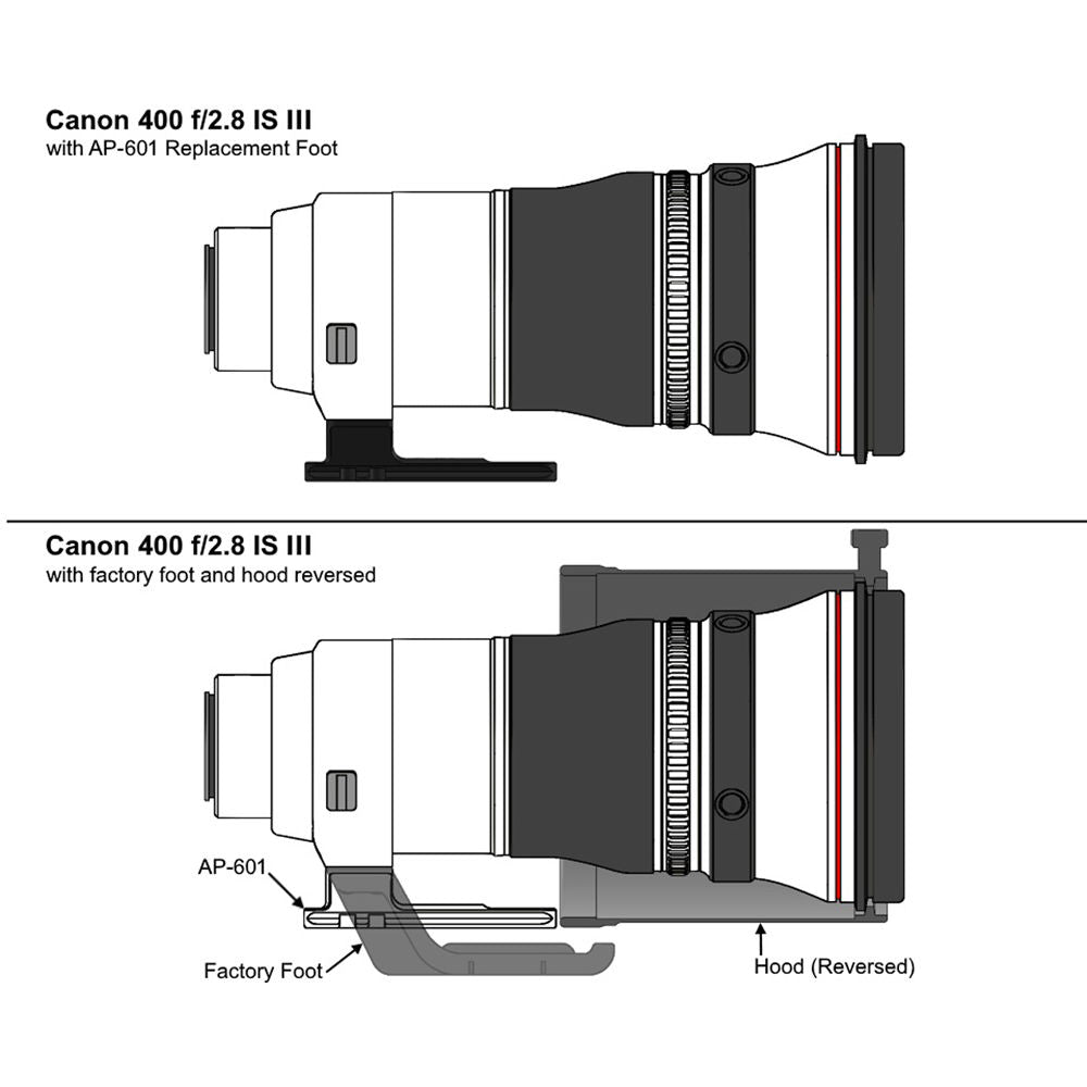 Designed for the Canon EF 400mm f/2.8L IS III USM lens, the AP-601 Quick Release Replacement Foot from Wimberley is an anodized 6061 aluminum foot that is Arca-type compatible for use with most clamps and heads on the market. By replacing the original factory foot, the AP-601 adds rigidness and stability and reduces flex and vibration while mounted on a head. Additionally, a double dovetail allows accessories to attach to the bottom or the top of the foot. The lower profile of the plate provides better balance when mounted on a head as well. If you're going to use the optional safety stop screws, Wimberley recommends using a clamp with channels, which allow the screws on the foot to slide back-and-forth.
