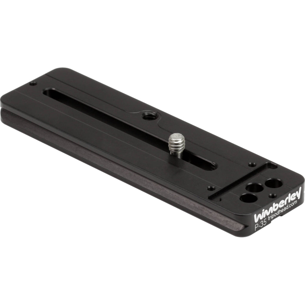 The P-35 Quick Release Lens Plate from Wimberley is a 5" long anodized 6061 aluminum plate that has an Arca-type double-dovetail design, which allows the plate to mount into a compatible clamp or have accessories mount on the top of the plate as well. The plate attaches to a large telephoto lens that has a collar-mounted tripod foot. Therefore, it provides a quick release capability to the telephoto lens. The center slot channel on the lens allows you to position and reposition the plate on the tripod foot, and the optional safety stops prevent the plate from sliding out if a quick release is accidentally opened.