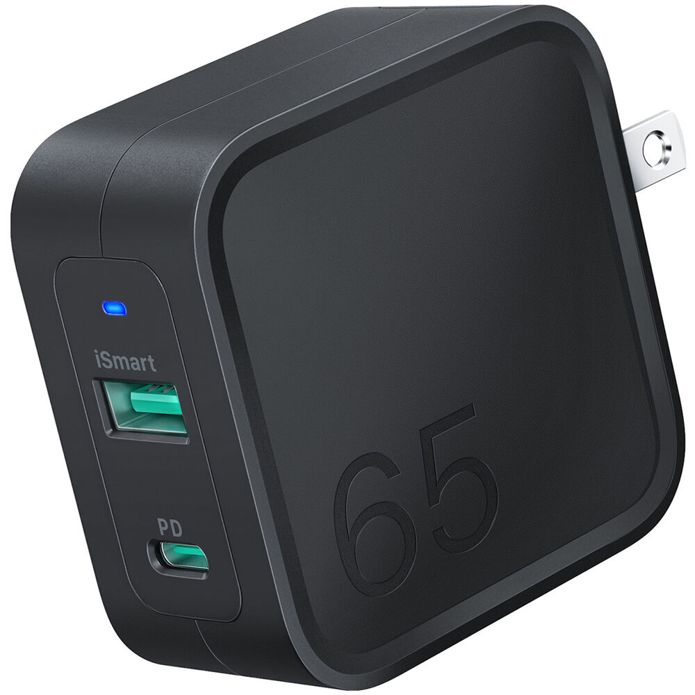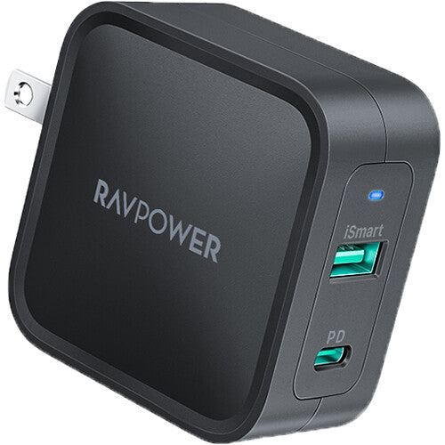 Quickly recharge power-hungry devices with the 65W 2-Port USB-C/USB-A Charger from RAVPower. Providing up to 65W of power, this charger is ideal for use with everything from smartphones to laptops. You get a USB-C port that supports fast-charging Power Delivery 3.0 technology, and a USB-A port that supports Quick Charge 3.0. Using GaN technology, the charger provides all this power while staying compact and cool.