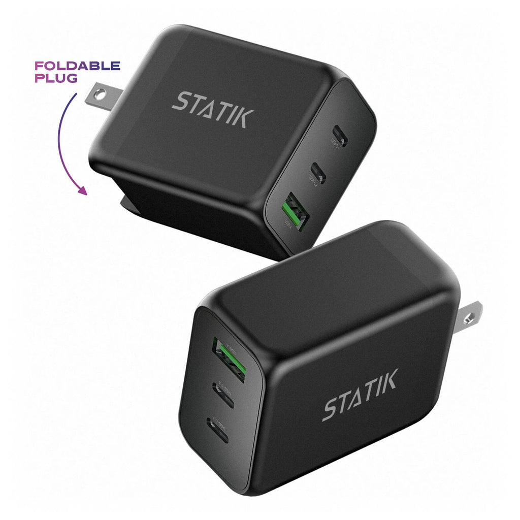 Power everything from phones to laptops with this 65W GaN 3-Port USB Wall Charger from Statik. Thanks to GaN technology, this compact charger can stay small while delivering a maximum of 65W of power. This power is shared across two USB-C and one USB-A port, letting you charge up to three devices simultaneously. As they recharge, built-in temperature protection works to keep them safe. This kind of power capability is useful at home or in the office, but thanks to a folding travel-friendly plug, you can easily take this on personal and business trips too.