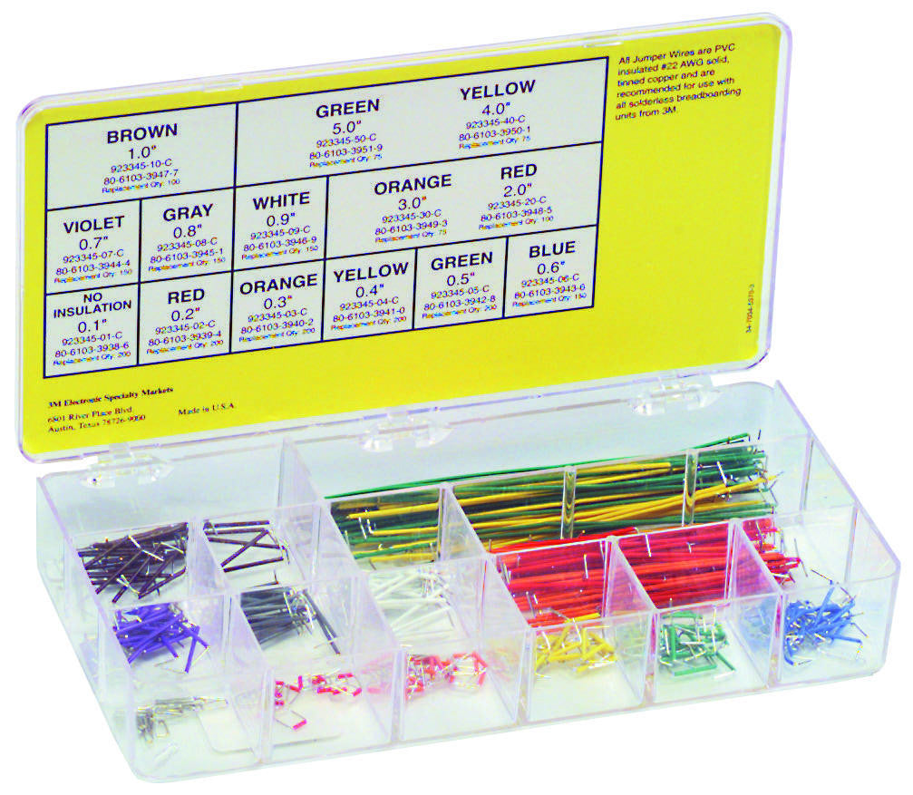 This is a JUMPER WIRE KIT, 350 PIECES, 22 AWG, 14 LENGTHS, ASSORTED COLORS product from 3M with the model number 923351-I