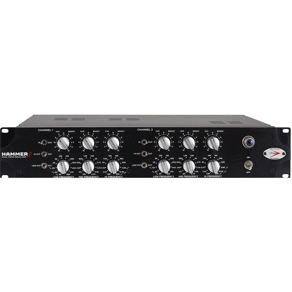Hammer 2 EQ Equalizer features tube-harmonic filtering circuit, a pair of 12AT7 tubes, and a custom heavy-duty toroidal power transformer. It also features a black, custom-milled, brushed faceplate sporting custom-milled aluminum control knobs, a heavy-duty Carling toggle power switch, and a big blue jewel power indicator lamp.