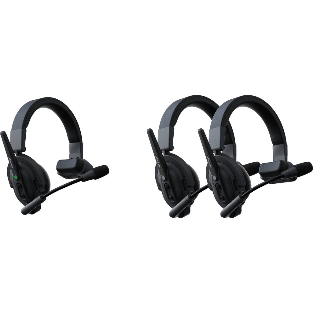 Intercom with two others without a hub using this CoMo Wireless Intercom Headset Kit from Accsoon. This kit includes one host headset that connects to the two included remote headsets up to 1300' away, providing clear audio for over 13 hours. The headsets don't need an external hub to operate and feature a battery, antenna, microphone, a single earpiece, and a padded, adjustable head strap, all built in.