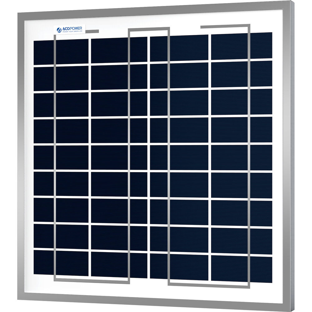 Suited to home, RV, van life, and many more applications, the ACOPower 15-Watt Polycrystalline Solar Panel collects renewable energy for charging 12-volt batteries and portable power stations. Pre-drilled for easy installation on a structure or vehicle, the panel is made with tempered glass that's been treated with antireflective coating, plus two layers of EVA film, a TPT backsheet, and an anodized aluminum frame�all designed to withstand snow loads of 5400 Pa and wind pressure of 2400 Pa. The junction box on the rear of the panel carries an IP65 water-resistance rating. The panel comes with a 3.2', 16 AWG cable with male and female quick connectors.