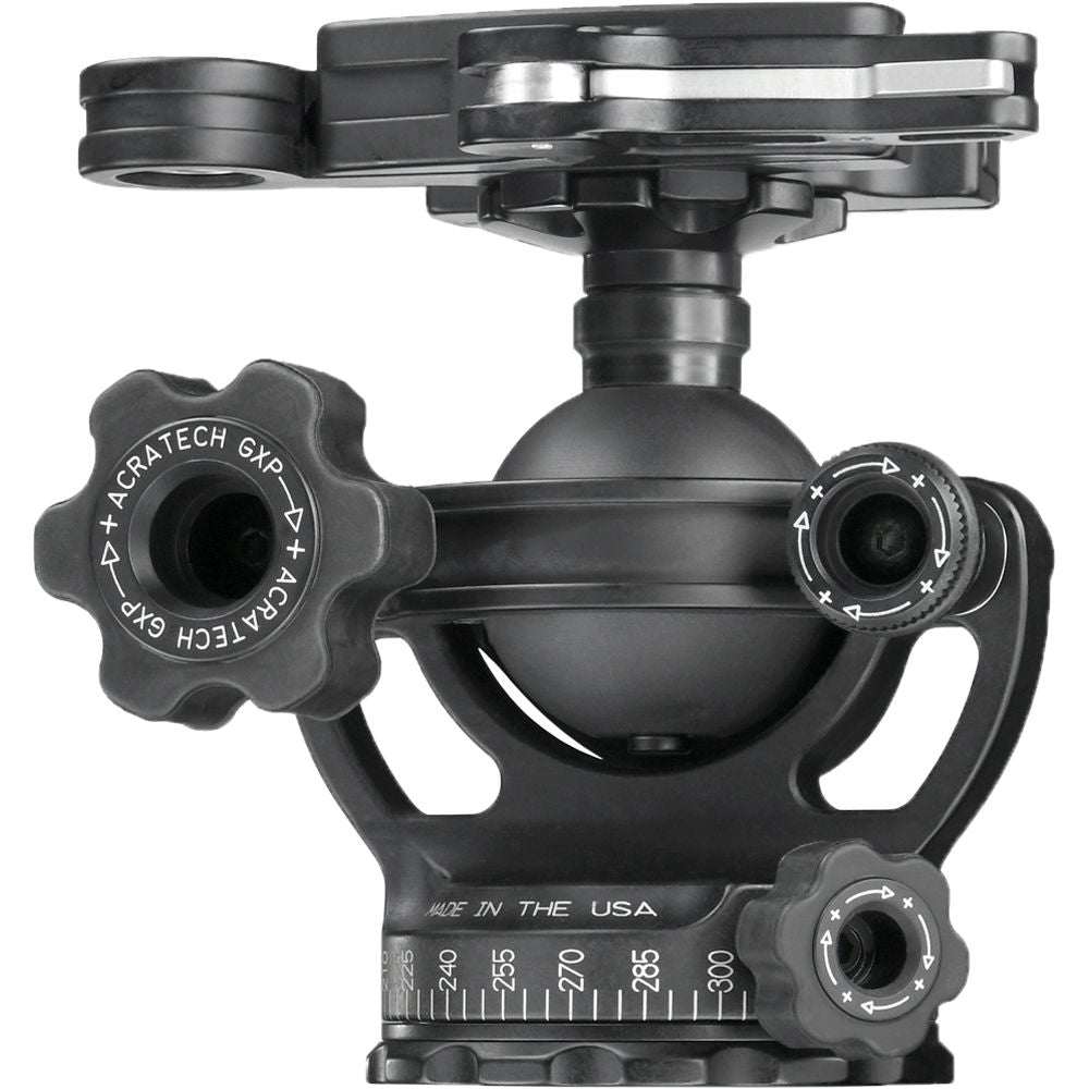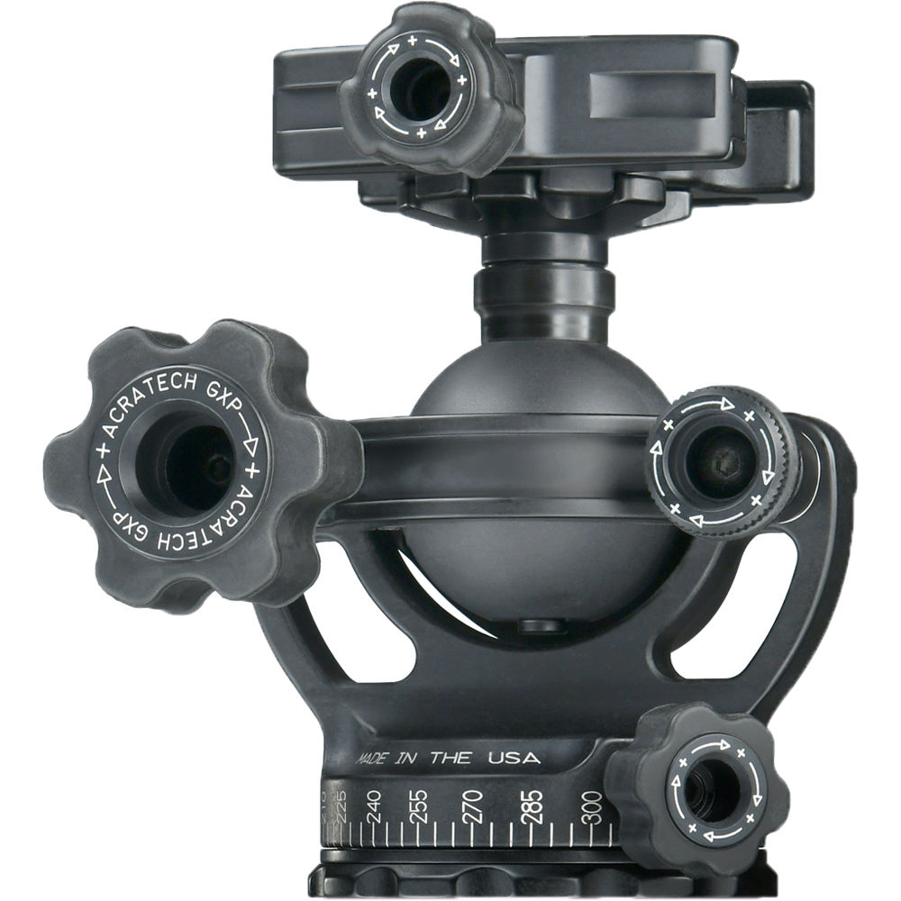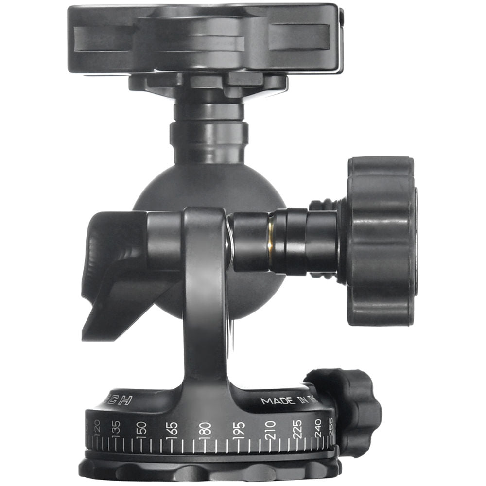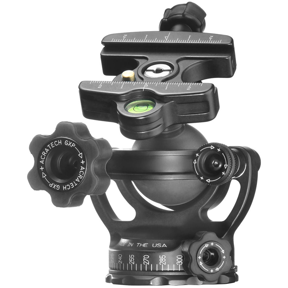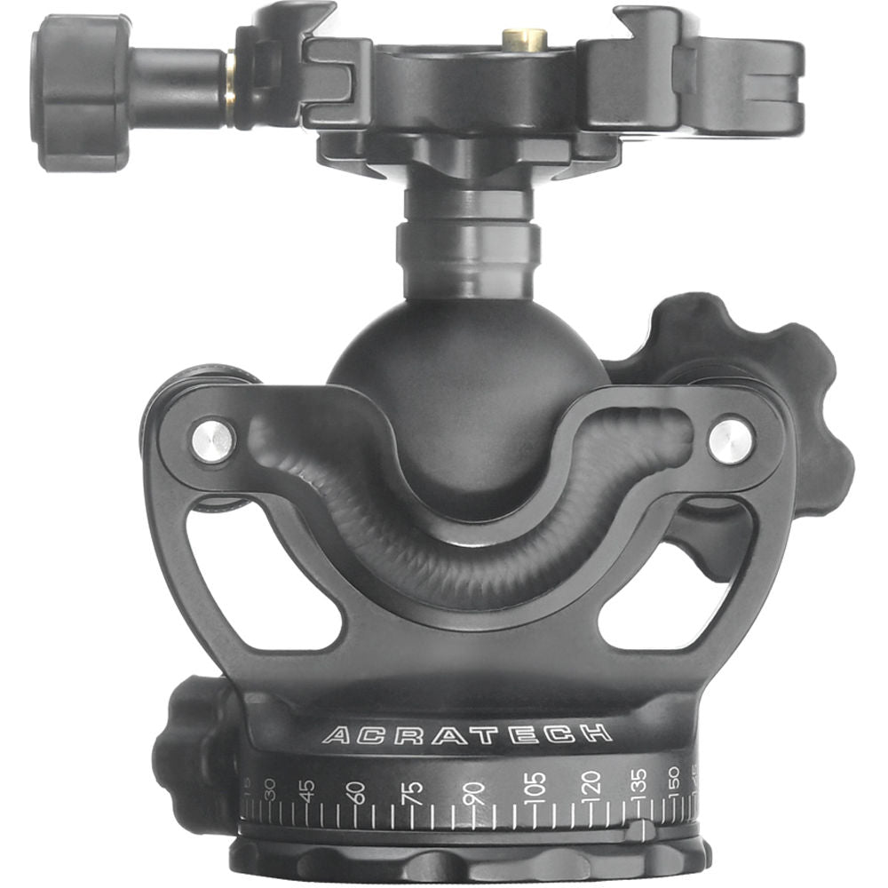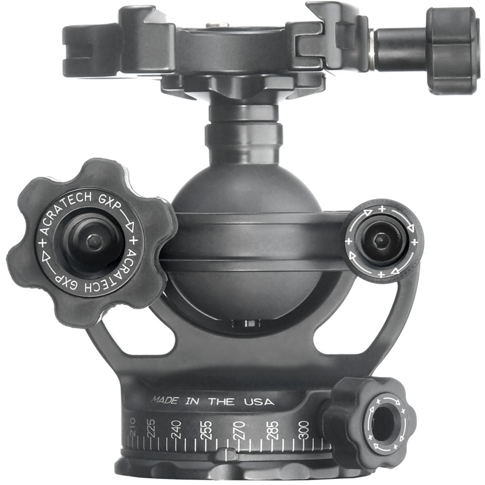 The lightweight 1 lb GXP Ball Head with Knob Clamp from Acratech has a 3-in-1 feature designed to have two more functions other than just your conventional ball head. The Arca-type clamp on the head is removable from its stem, and it is mountable in the reverse to the base of the ball head. With the clamp removed, the ball head's stem has the same 3/8"-16 mount as the base, which includes a reducer bushing. The clamp itself has a single bubble level that allows you to balance and level out the ball. At the same time, you can unlock the independent pan lock and rotate lenses as large as 400mm and equipment weighing up to 50 lb. Together with a laser-engraved numbered scale, you can precisely create panoramic images by turning the ball head at incremental stops.