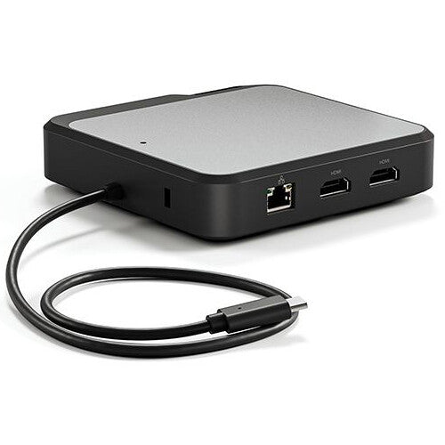 An integrated USB-C 3.2 Gen 2 cable connects to your host device, instantly expanding your device's capabilities. Two HDMI video-out ports enable you to connect two monitors with support for resolutions up to 3840 x 2160 with a 60 Hz refresh rate, giving you a clear and smooth picture suitable for work and play. One USB-A and one USB-C 3.2 Gen 2 port give you data transfer speeds up to 10 Gb/s, allowing you to quickly move data to and from external storage and flash drives. An additional USB-C port found on the side of the dock supports 100W Power Delivery, keeping your host device charged up when paired with an optional AC wall adapter. A full-size SD Card slot supports UHS-II cards, enabling you to upload your photos and videos for editing. An RJ45 Ethernet port allows you to use a wired network connection for quick uploads, downloads, and cloud access. Additionally, a lock slot supports a wide range of security devices, preventing unauthorized users from removing the dock from your desk.