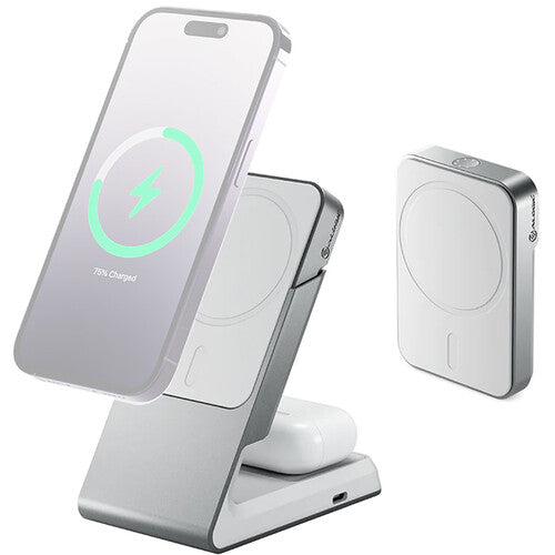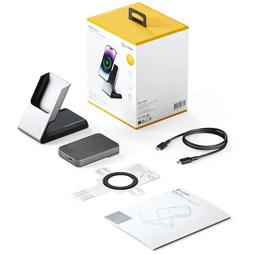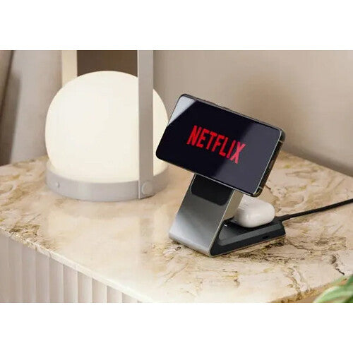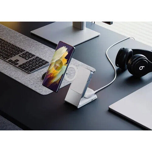 The white Matrix 2-in-1 Magnetic Smartphone/Earphone Charging Dock from ALOGIC is a sleek, space-saving desktop charger that can be used almost anywhere in your home. The dock is specifically designed to wirelessly recharge a smartphone and headphone case via built-in Qi and MagSafe charging pads. Your smartphone magnetically snaps to the stand, where it receives up to 15W of power. Your earphone case sits snugly on the base behind the stand, getting up to 7.5W of power. Power is provided via the included USB-C cable and your existing power adapter (not included).