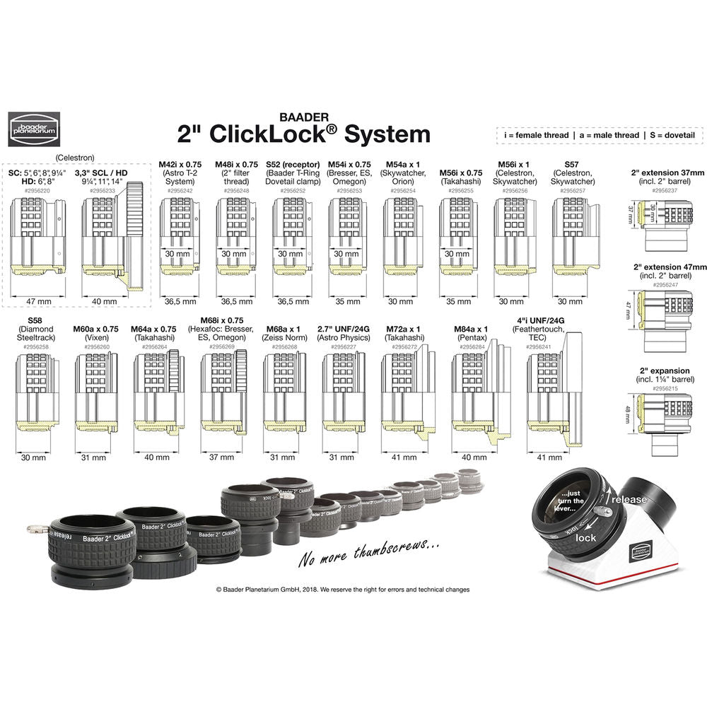 The Alpine Astronomical Baader 1.25" to 2" ClickLock Expansion Adapter allows you to use larger 2" eyepieces in the more common 1.25" size holders. It has a standard 1.25" nosepiece, with a 2" ClickLock holder on the other side. This unique eyepiece mounting system is superior to conventional mountings. Unlike compression ring and set screw holders, the ClickLock system uses three long roller bearings to hold the eyepiece firmly centered in place without marking or marring it, while eliminating wobble and off-axis tilt that may occur with ring & screw systems. A simple 20° twist locks and releases the clamping system for fast eyepiece changes even while wearing gloves. There is no need to fumble with small set screws or for using excessive force and torque to hold the eyepiece in a fixed position.
