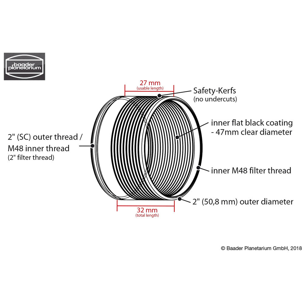 An improvement on conventional models, the Alpine Astronomical Baader 2" Safety Kerf Nosepiece employs a series of shallow grooves along the portion that gets inserted into focusers or other accessories to provide additional grip and security from inadvertent slipping, without the problems sometimes caused by traditional deep undercuts. The whole piece measures 32mm in length, with 27mm of optical length to fit deeply into holders. One side has standard 2" male outer Schmidt-Cassegrain telescope (SCT) threads, and both sides have inner eyepiece filter threads. To improve image contrast the interior and exterior of the nosepiece are treated with a matte-black anti-reflection coating.