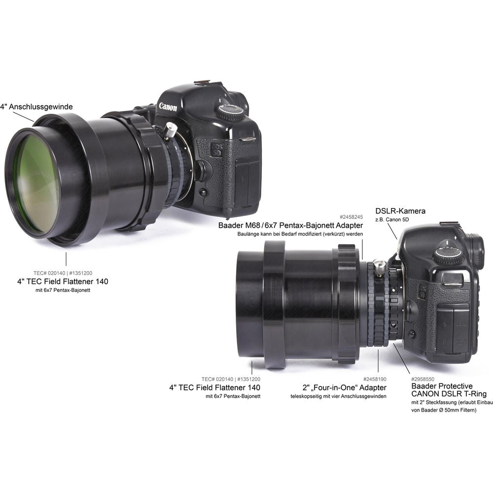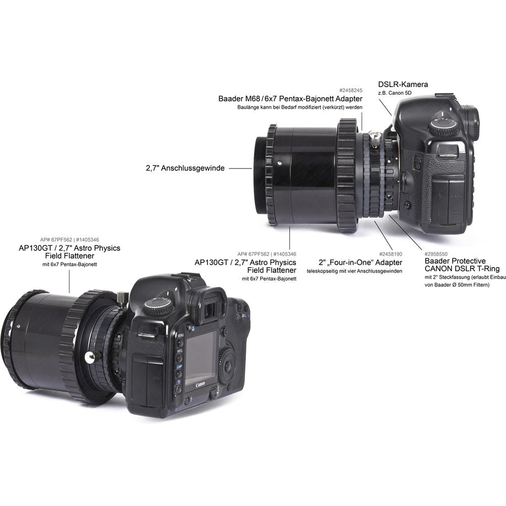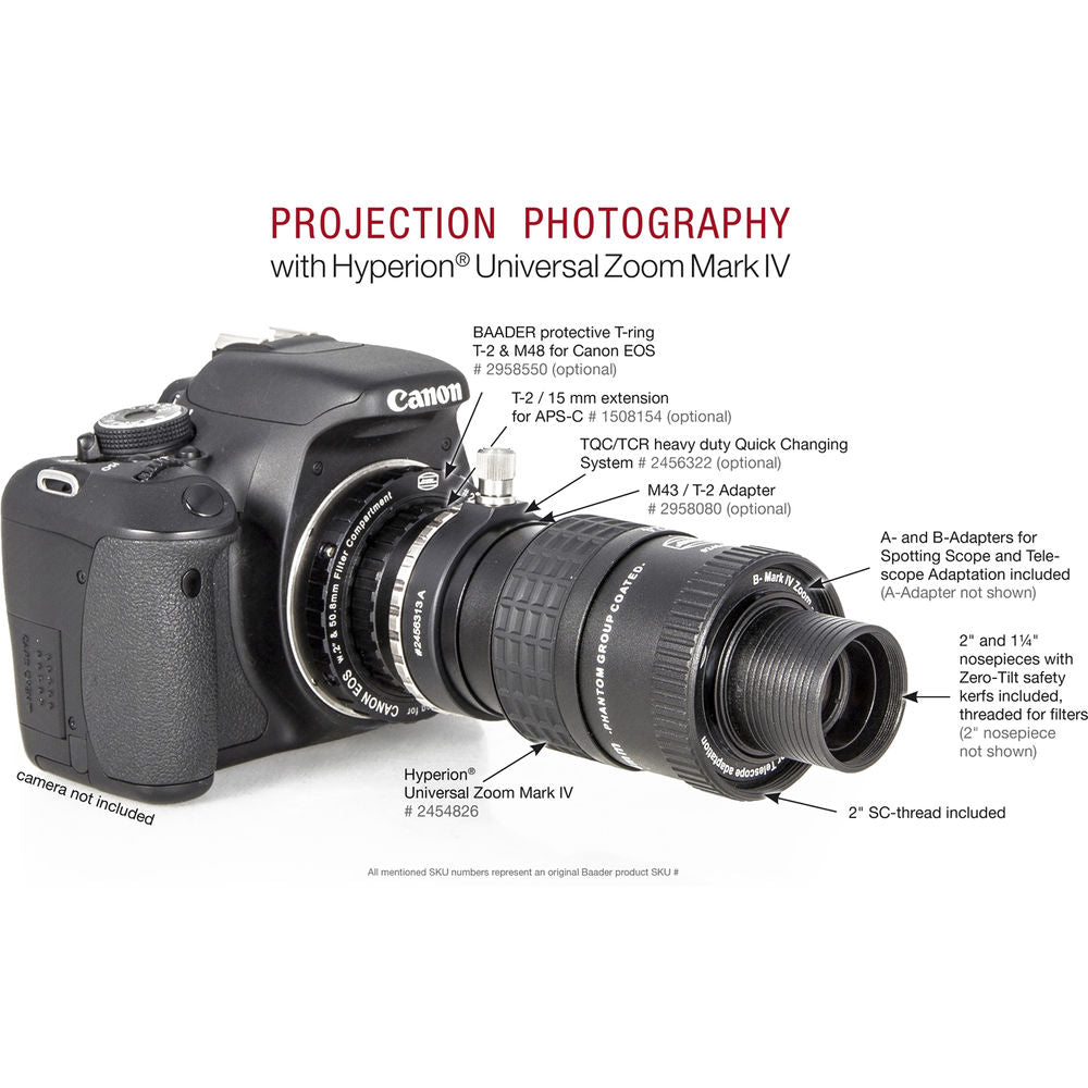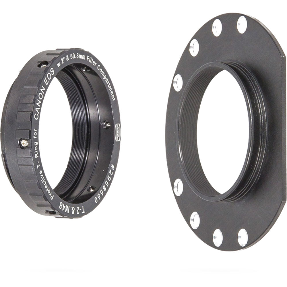 Engineered to take advantage of today's larger camera sensors, the Alpine Astronomical Baader Canon EOS Wide T-Ring System eliminates the vignetting that is common when using conventional T-rings, especially on faster systems. The modular design enables the use of an array of Baader 2" mounted or 50.4mm unmounted specialty filters such as O-III, H-alpha, luminance, or neutral density. It comes with three mounting options: a standard 42mm T-thread for conventional T-mount attachment, a low-profile 2" nosepiece to fit into diagonals and visual backs, and a standard 48mm astronomical filter thread. This system is specifically designed to match the Canon EOS bayonet mount. The T-ring assembly comes with a 50.4mm round unmounted UV/IR cut filter that blocks ultraviolet (UV) light below 400nm and infrared (IR) above 680nm to allow only the visual spectrum between to pass through.