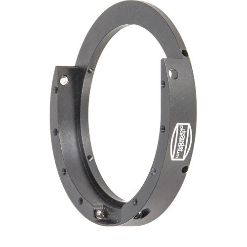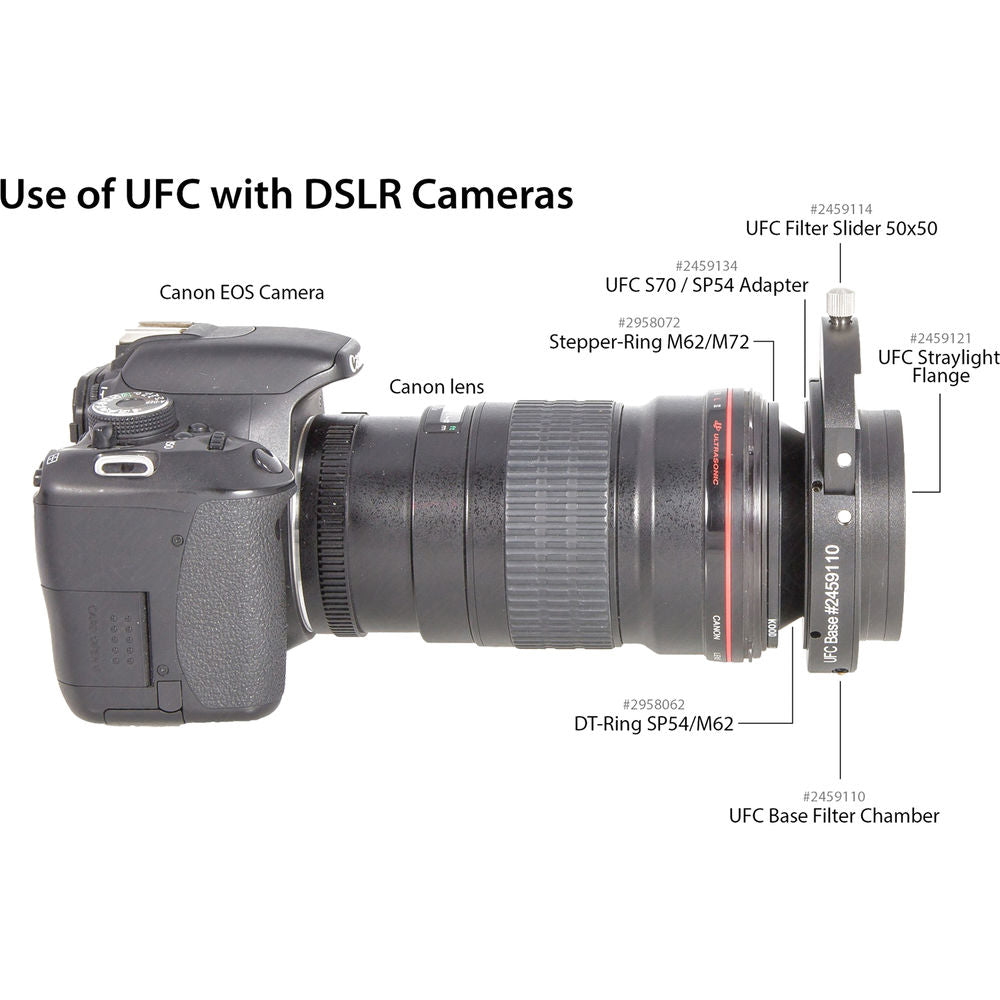 The front of the base has eight threaded holes that accept the included set screws for attaching one of several optional camera lens adapters. The rear of the base accepts optional telescope adapters and extensions. When fully assembled, the front plate screws into the camera lens filter threads, the base accepts your various filters, and the rear attaches to a variety of optical tube assemblies.