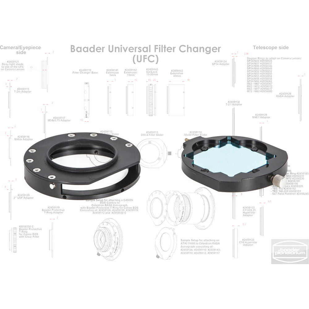 An integral part of their Universal Filter Changer System, the Alpine Astronomical Baader UFC Base/Filter Chamber is the component that holds one of the three available filter sliders and allows you to quickly and easily change filters without having to disassemble your imaging rig. With this system you can, for example, switch between multiple colored filters for imaging a series of selective wavelengths with very little effort or time between changes. Use this for stacking in post-production to create custom images of the moon, planets, nebulae, galaxies, and more.