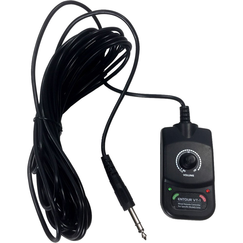 Plug in the male 1/4" pin of this Entour VT-1 Wired Remote Control replacement to your Entour Faze, Snow, or Cyclone and perform wired remote operation from up to 25 ft away. The straightforward design of the control features a central volume potentiometer-style knob and two lights�one red to indicate power is connected, and one green to indicate the machine's readiness. Turning the knob will increase or decrease the rate of snow, faze, or wind that is output from the machine.