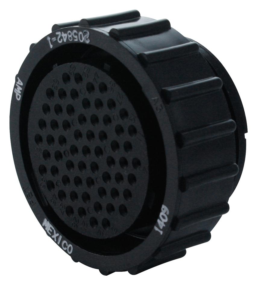 The 205842-1 is a 63-position straight Free Hanging Plug with black thermoplastic housing and 23-63 insert arrangement. The series 2 CPC connector for cable mount. The series 2 connector accepts size 20 DF (precision formed) and size 20 DM (screw-machined) socket contacts. Maximum current carrying capability is 7.5A.