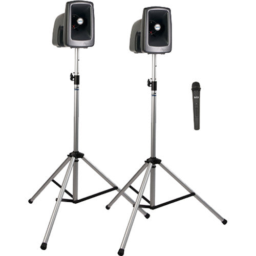 The Anchor Audio MEGA-DP1-AIR-H is a MegaVox 2 deluxe AIR package consisting of a MEGA2-XU2 MegaVox 2 portable PA system, a MEGA2-AIR wireless companion speaker, two SS-550 speaker stands, and one WH-LINK wireless handheld microphone. It offers simple setup and a high maximum SPL for broad crowd coverage in a variety of indoor and outdoor events where voice amplification is a priority. The WH-LINK microphone wirelessly transmits over the 1.9 GHz frequency band to the dual wireless microphone receiver in the MEGA2-XU2, which is easily placed atop the included speaker stand. The MEGA2-XU2's built-in rechargeable battery enables hours of reliable operation even when there are no power outlets to be found.
