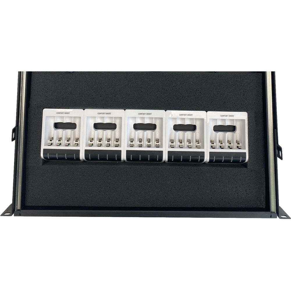 Enjoy the convenience of rackmount charging with this 1 RU 20-Channel Comfort Smart Rackmount Kit from Ansmann for AA and AAA batteries. It includes comfort series battery chargers and utilizes a multi-port USB power supply contained with the rack drawer. The unit charges AA's in about 2.5 hours and allows for individual monitoring of cells. The trickle charge feature keeps batteries ready to go after charging.