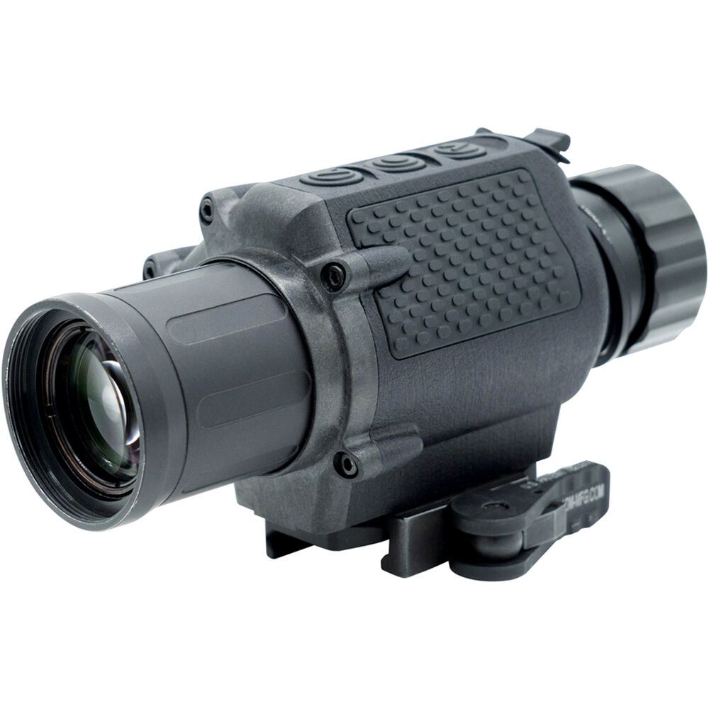 The Jockey 640 Compact Thermal Clip-On from Armasight mounts in front of any 1-6x daytime riflescope and enables it to be used as a night vision device. Its 640 x 480 thermal detector can detect human-sized heat signatures up to 1019 yards away, displaying imagery on a 1024 x 768 OLED monitor and capturing video and photos. Suitable for AR platform or rimfire rfiles, airguns, and crossbows, the Jockey offers multiple color palettes, simple three-button control, and four hours of runtime on two CR123A batteries. It comes with a quick-detach mount for your rifle's rail.