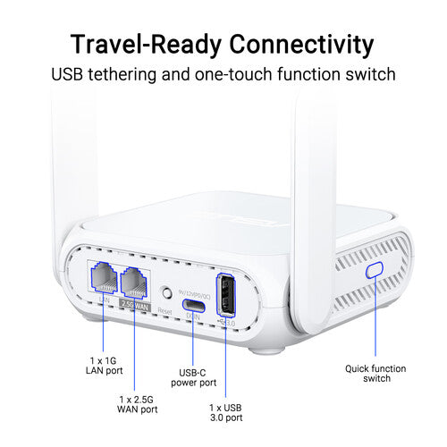 Featuring a compact and versatile design, the ASUS RT-BE58 Go BE3600 Wireless Dual-Band Gigabit Travel Router makes for an ideal companion when on the road. With three modes, you can configure this compact router to fit your environment.