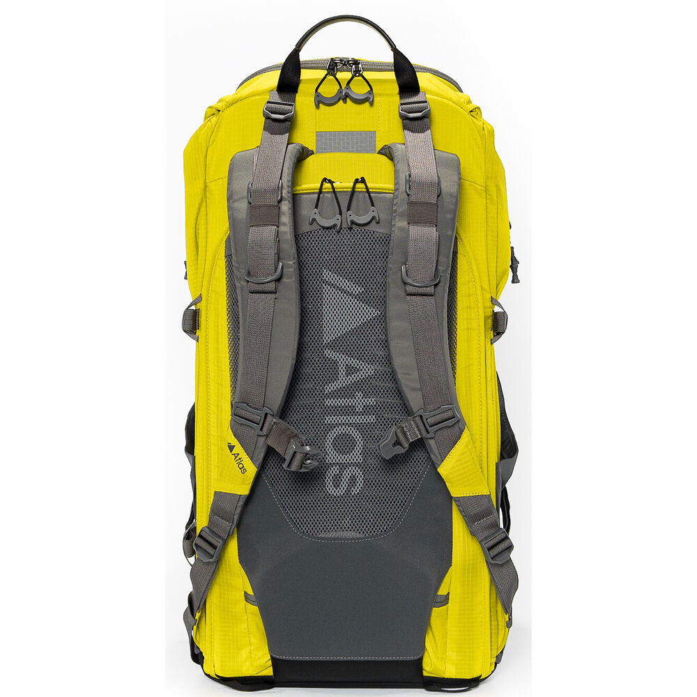 The medium Athlete Camera Backpack in yellow from AtlasPacks is a travel pack designed to transport and protect large amounts of gear on your outdoor adventures. Made from weatherproof 240 double ripstop fabric, it has a removable frame, plus multiple pockets and attachments. The bottom has a slight taper and the pack loosens up towards the top by about 6". Long lenses and camera bodies may extend beyond the top of the divider and sidewalls. Once inside, gravity takes over, the foam compresses, and the bag secures your lenses firmly.