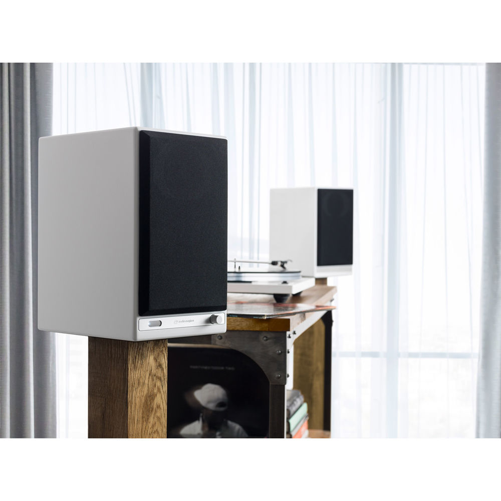 Designed to connect to virtually any device, the hi-gloss white Audioengine HD6 Bluetooth Speakers provide an analog RCA stereo input, an optical audio input, and 1/8" input, and Bluetooth connectivity with aptX HD allows for wireless connectivity with your compatible devices. The speakers consist of a 5.5" woofer and a 1" tweeter and output up to 50W per channel RMS, or 75W per channel peak. For your convenience, all connectivity is via the powered left speaker, which connects to the passive right speaker with the included speaker wire. In addition to the included speaker wire, an 1/8" audio cable, RCA audio cable, magnetic removable grilles, and IR remote are also included.