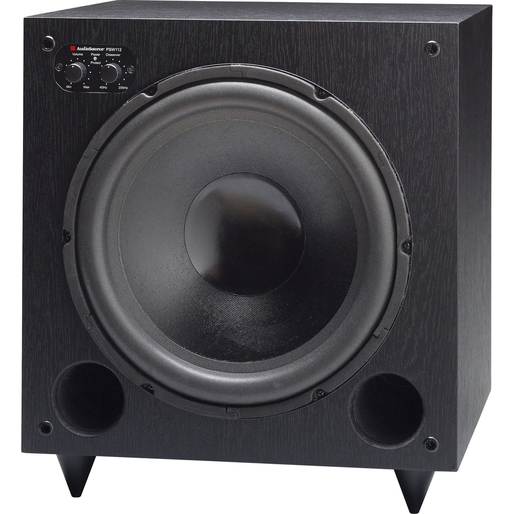 If you're looking to enhance the bass in your home theater system, the AudioSource PSW112 12" Powered Subwoofer represents pure sophistication in subwoofers at an affordable price. It features an internal 175W Class A/B amplifier, dual front-firing ports, front-firing 12" long-throw woofer, 0 - 180? phase control switching, and a durable MDF enclosure. This powerful design enables this subwoofer to reproduce the tightest "punch" at the highest sound levels in its class. Additionally, connectivity is achieved with (2) sets of speaker level inputs, and (1) set of RCA line-level inputs.