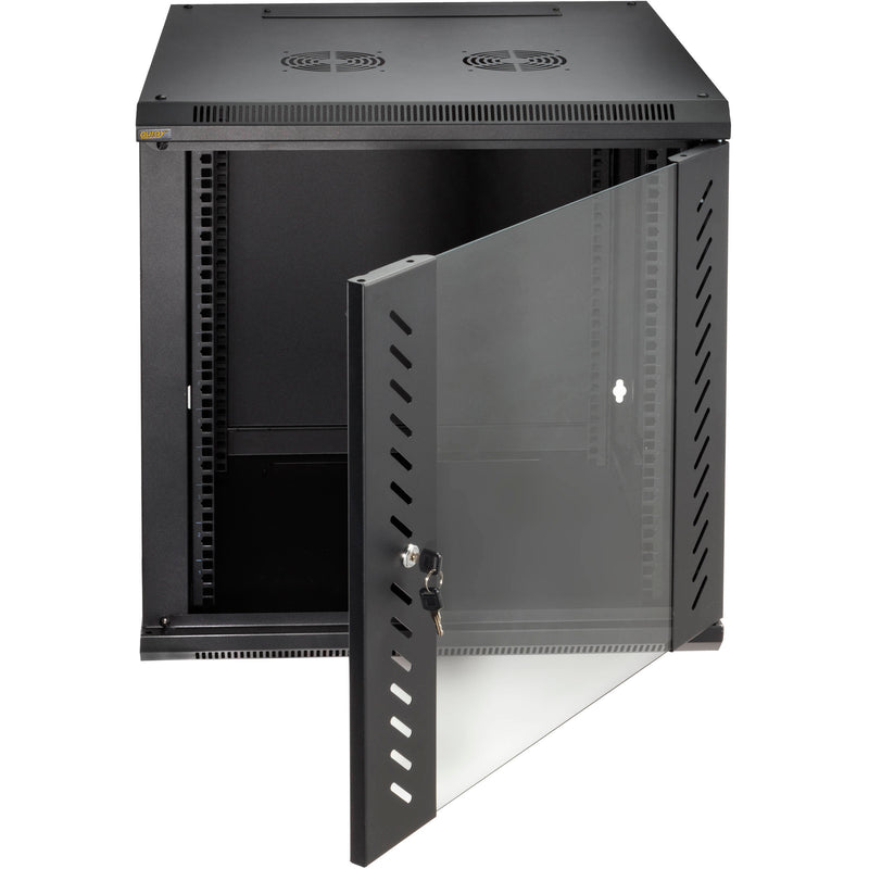 The Shallow Server Rack includes a locking door with transparent window for securing your installed devices from tampering, and the rugged steel construction can reliably hold gear up to 132 lb in weight. Constructed with vents that accept optional rack fans for steady airflow, this server rack is engineered for maximum protection of your equipment and includes large holes on the back, top, and bottom for easy cable runs in any direction.