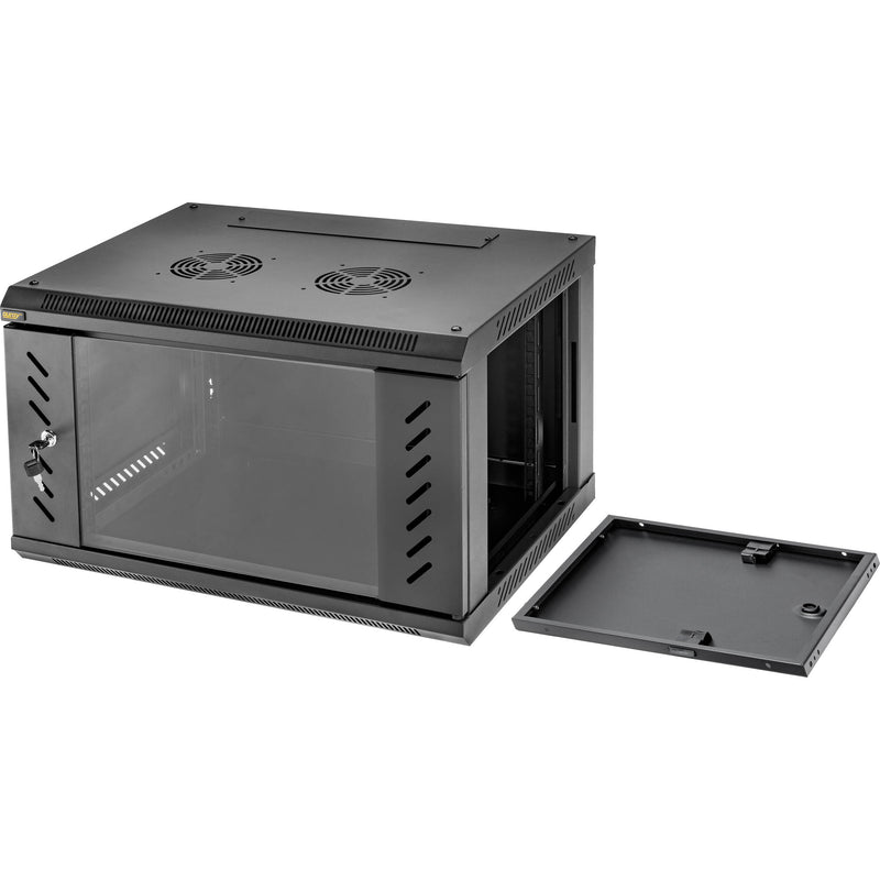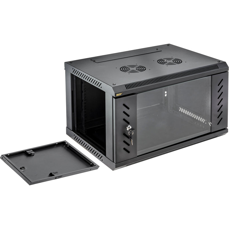 The Shallow Server Rack includes a locking door with transparent window for securing your installed devices from tampering, and the rugged steel construction can reliably hold gear up to 132 lb in weight. Constructed with vents that accept optional rack fans for steady airflow, this server rack is engineered for maximum protection of your equipment and includes large holes on the back, top, and bottom for easy cable runs in any direction.