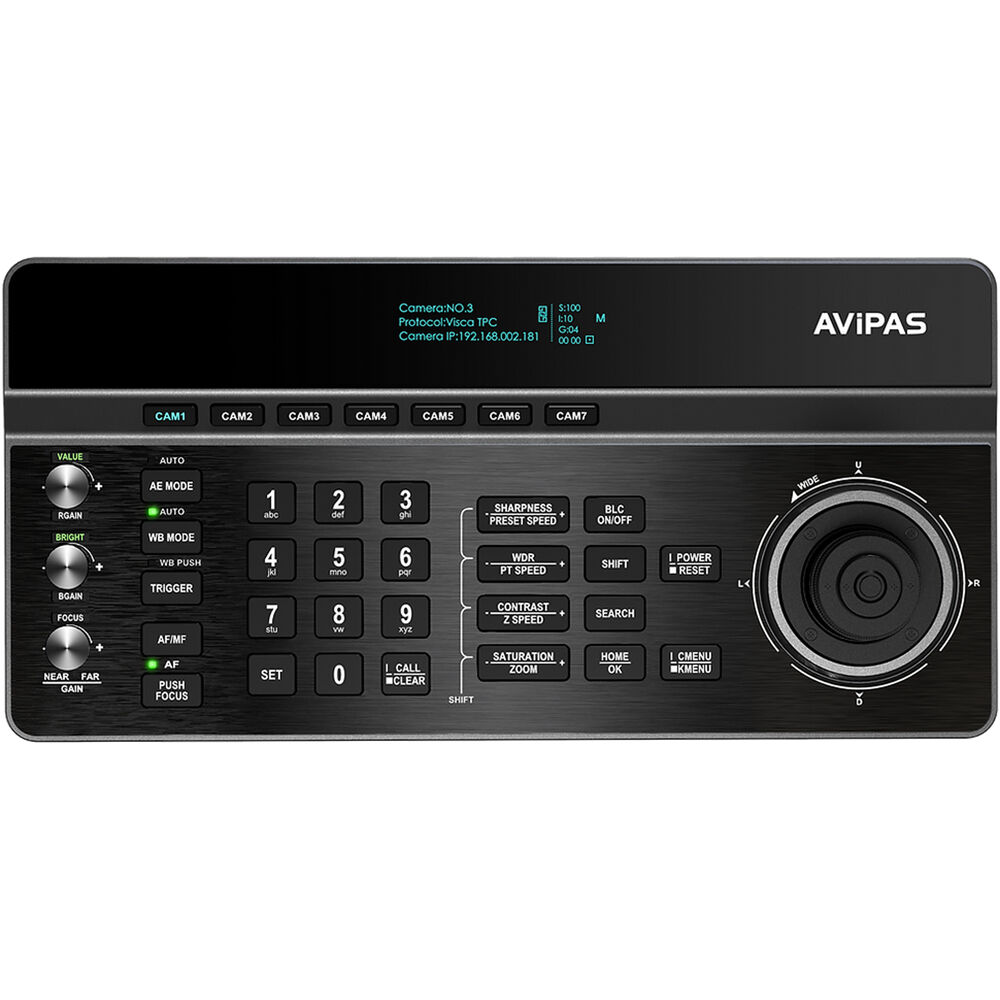 The controller also offers presets including gain, iris, focus, red and blue gain, white balance, color, and speed control settings to control the finer settings on the PTZ cameras. The AV-3207 features two IP control modes using VISCA IP and ONIF and three serial control modes using RS-422, RS-485, and RS-232. All configuration is done using the bright, backlit OLED display. The unit comes with a 12 VDC power supply or it can be powered using Power-over-Ethernet (PoE).