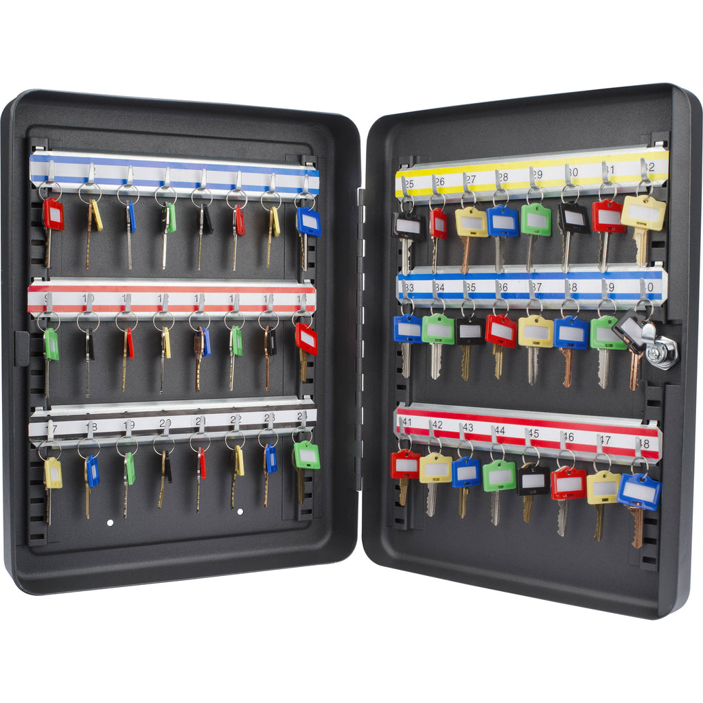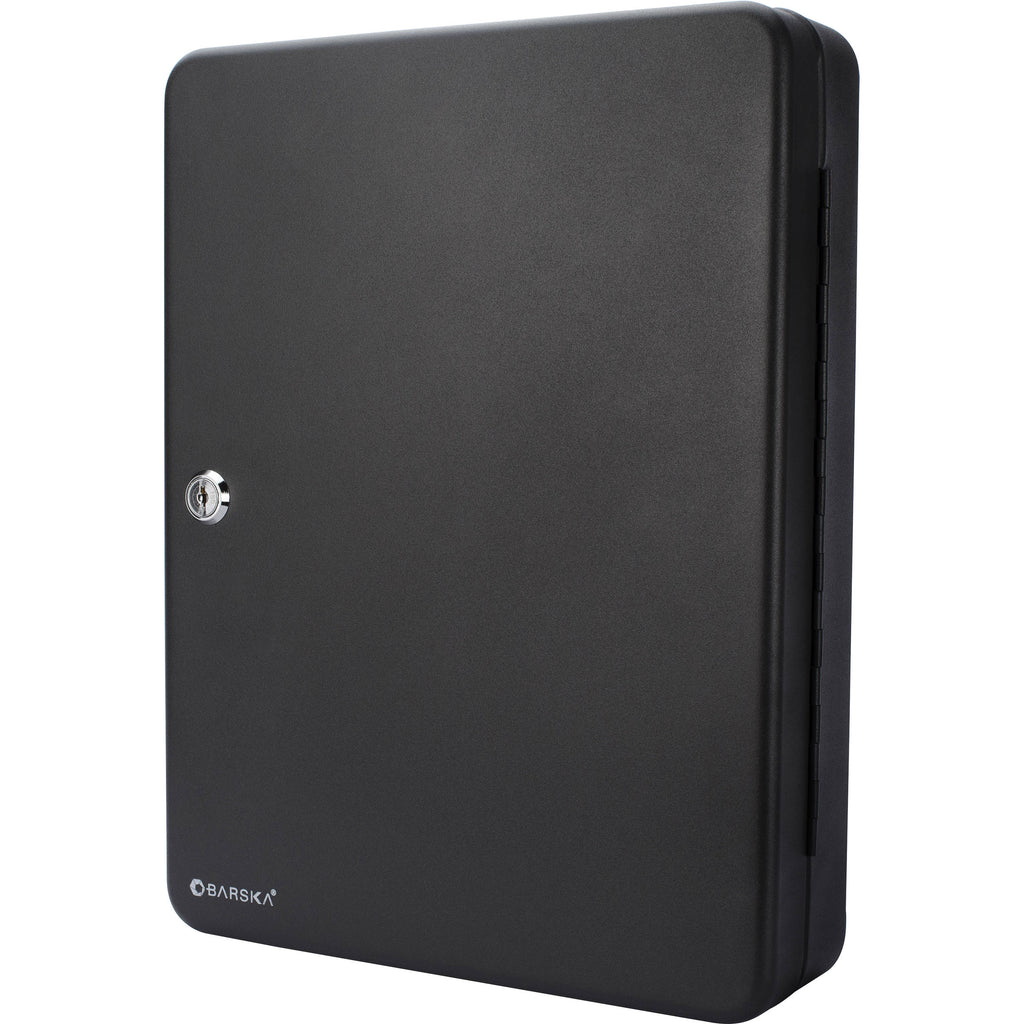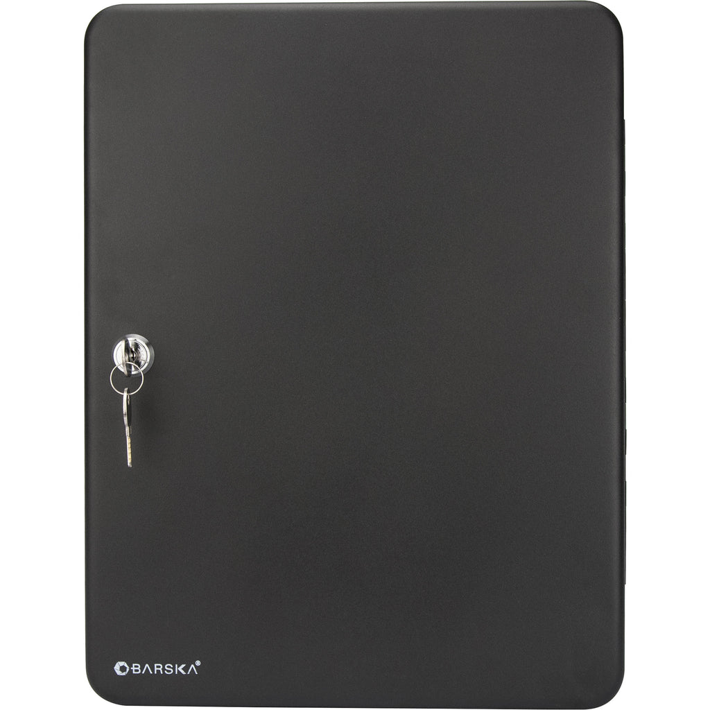 Keep all of the keys you need for your house, garage, or office building handy and organized with the 48 Position Key Cabinet with Key Lock from Barska. The 0.8mm steel door and walls resist tampering, and the locking door prevents unauthorized access. Labeled, movable/removable key shelves keep keys together by group so searching is kept to a minimum, and colored key tags provide a space to label them. Pre-drilled mounting holes and included hardware make installation simple.