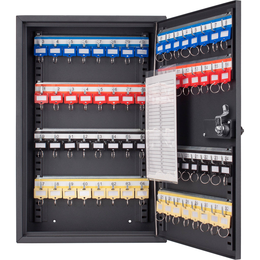 Secure up to 64 keys and keep them organized with the black 64-Position Key Cabinet with Combo Lock from Barska. It offers 64 color coded and numbered key hooks and comes with a key log sheet. The two-sided indexing chart has ample room to document the keys' hook position and corresponding lock, and a drop-in plastic sleeve tethered to the hinge inside the safe provides a hands-free reference. The steel cabinet measures 17.8 x 11.8 x 3.1". Four pre-drilled mounting holes and included mounting hardware make it easy to attach to a wall. It comes with two lock box keys.