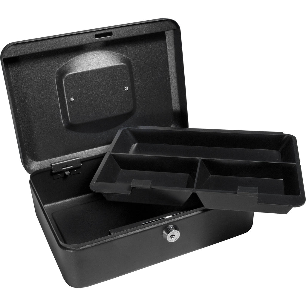 The black 8" Cash Box with Key Lock from Barska is a three compartment locking box designed for storing cash, coins, checks, and other valuables. This compact cash box has 0.8mm thick steel walls, three removable tray compartments, and a key locking mechanism.
