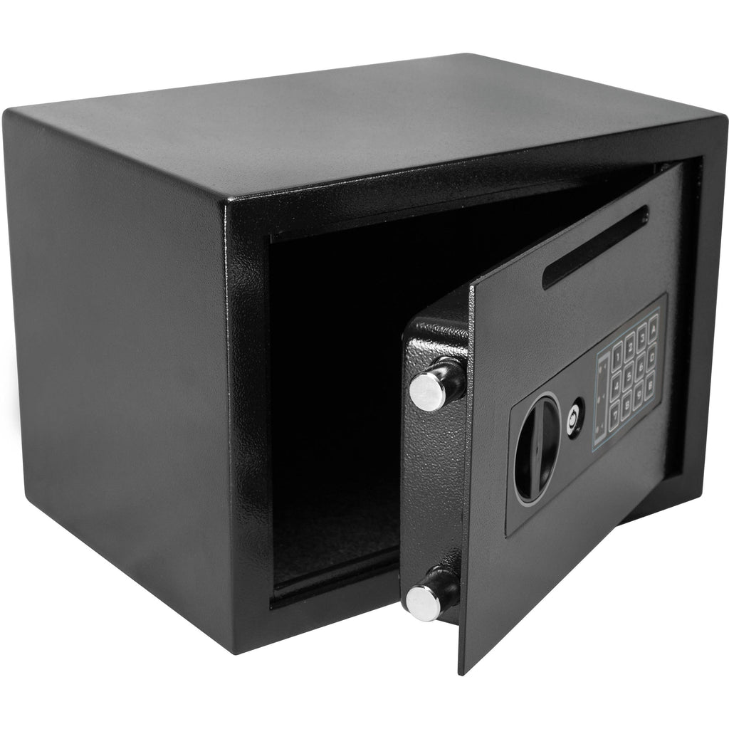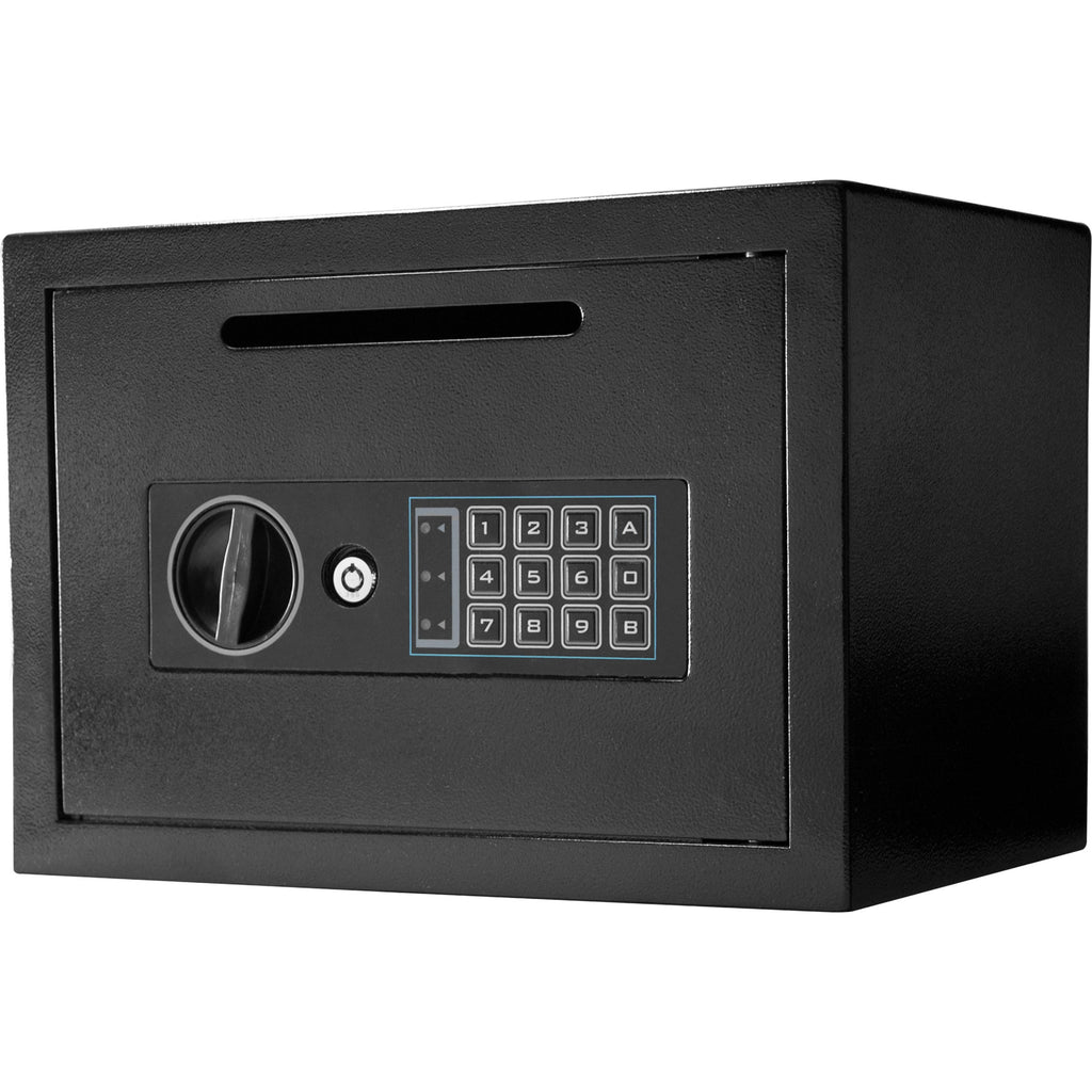 Two user-set personal identification number codes can be programmed into the keypad, and access can also be gained using the two backup keys. A narrow drop slot prevents deposited objects from being fished out, and the Lock-Out mode can be used to deactivate the keypad. The safe comes ready to be installed, with pre-drilled mounting holes and the necessary hardware.
