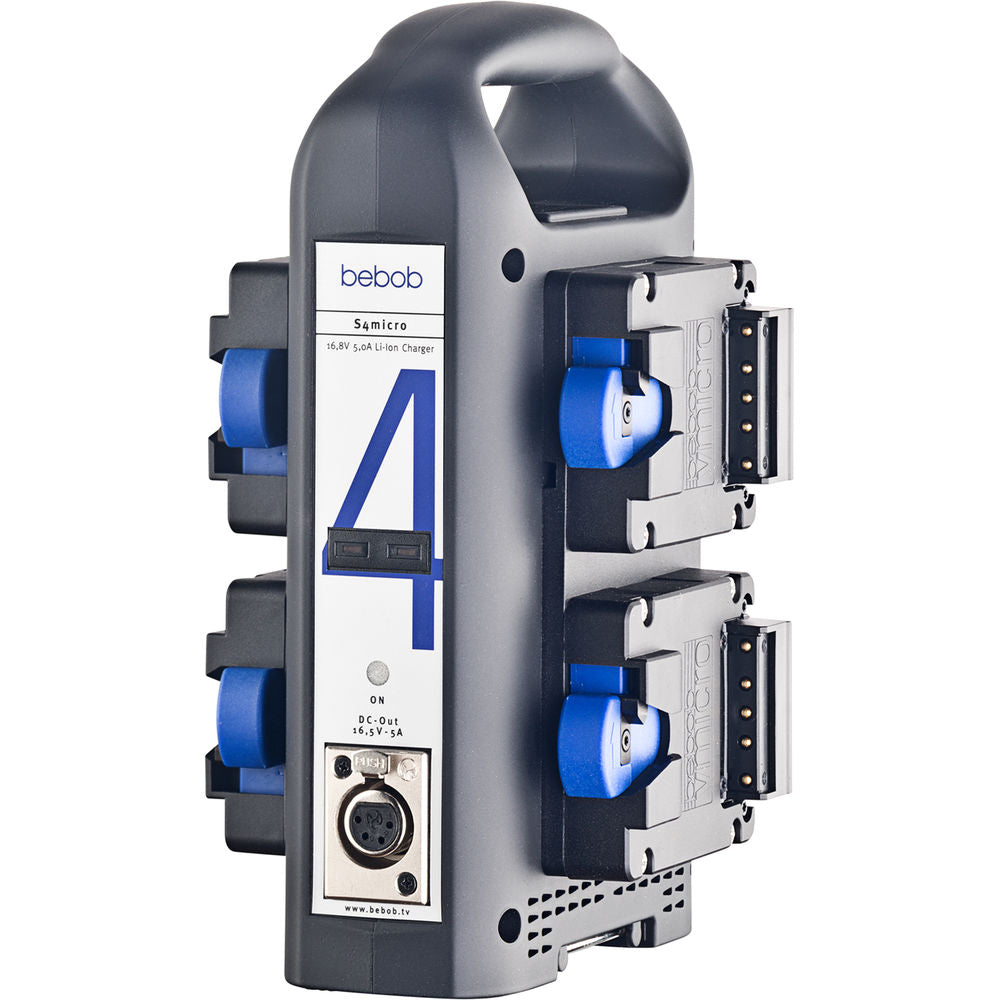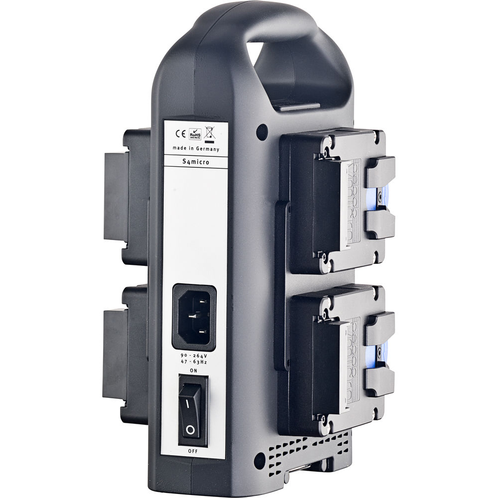 The 4-Channel VS4Micro Charger from Bebob is compatible with Bebob, IDX, and Sony V-micro, V-mount, and V-Cine batteries. This portable 4-bay lithium-ion charger features a built-in AC adapter, a 4-pin XLR DC output, and a cooling fan.