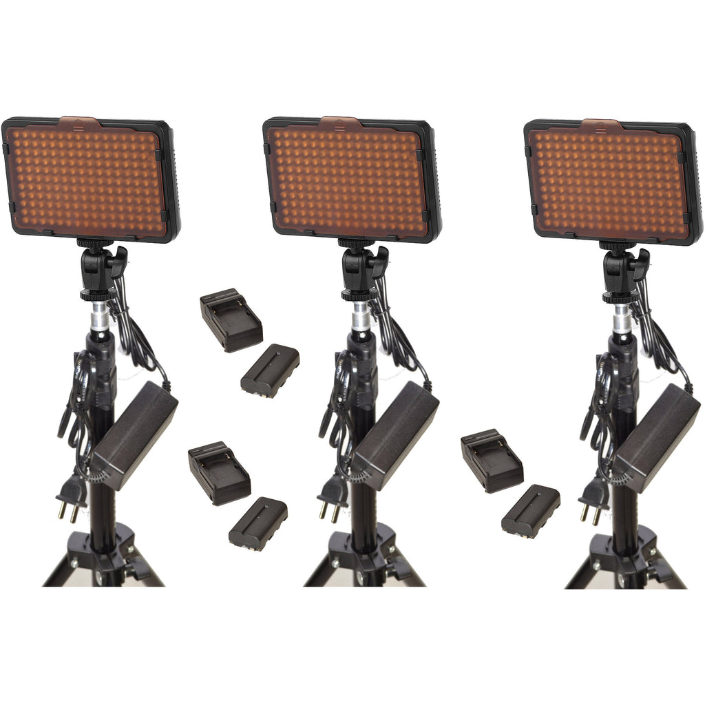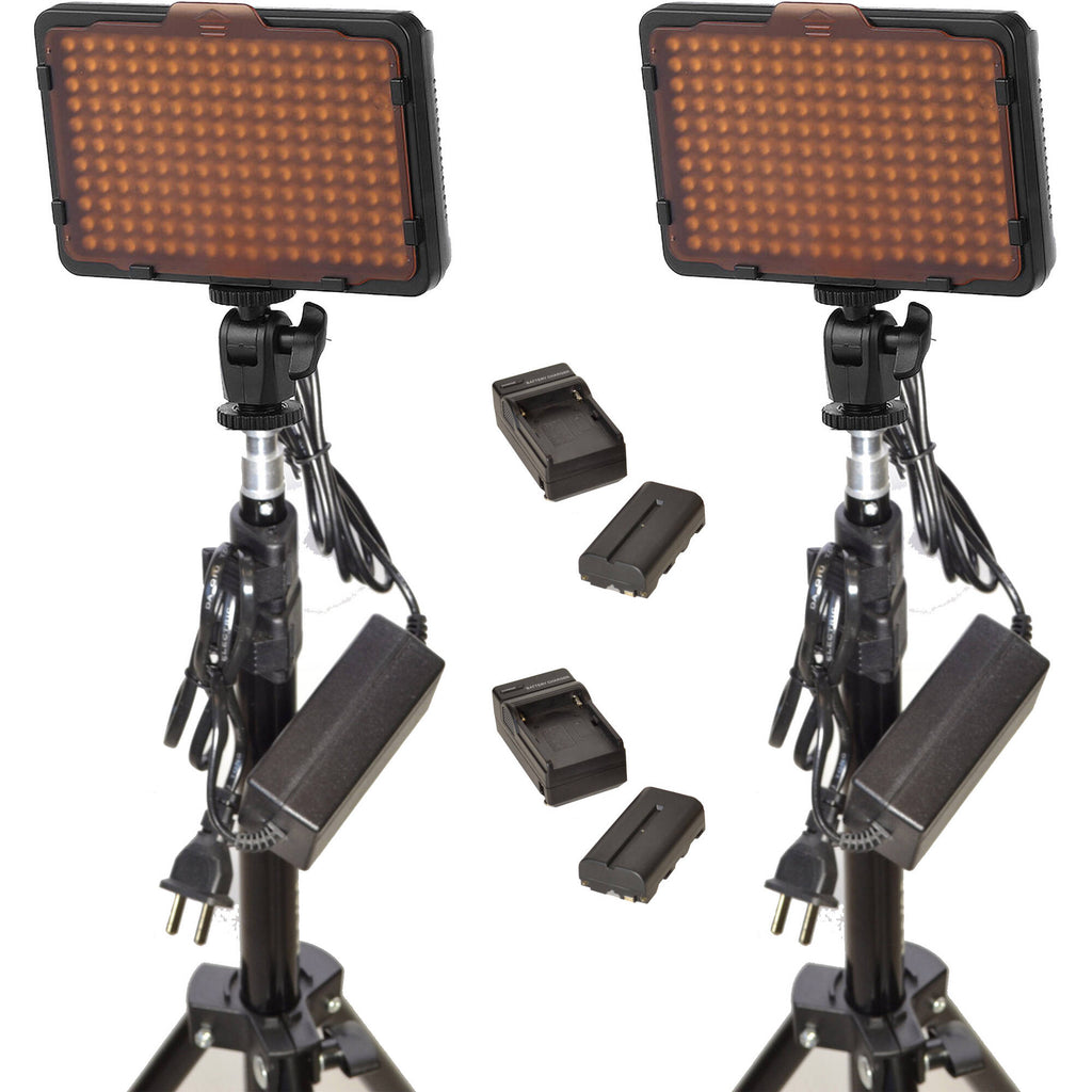 2 LED Lights (5.75 x 3.75 x 1.5")Daylight Balanced: 5600K, CRI: 952 AC Adapters2 NP-F Batteries and Chargers The Bescor WAFFLE 176 Bulb LED 2-Light Battery and AC Adapter Kit offers two LED light panels, each with an AC adapter, orange filter, clear filter, NP-F battery, charger, shoe mount, and 6.6' light stand.