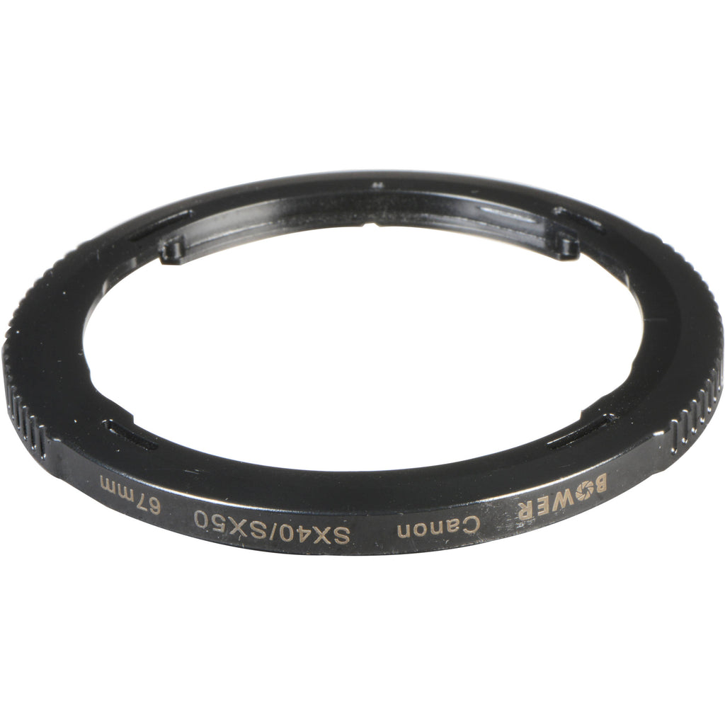 This Filter Adapter from Bower is used to mount a 67mm filter to the lens of a Canon PowerShot SX30 IS, SX40 HS, SX50 HS, and SX60 HS camera. The dedicated design of this adapter mounts directly to the front of the lens and does not affect zoom control or focusing performance.