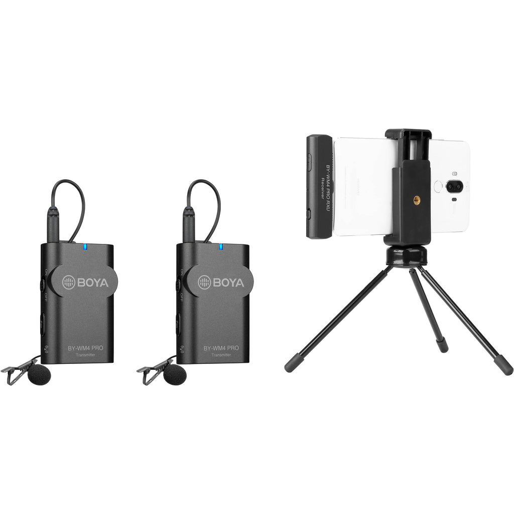 For Video, Vlogging, YouTube, Instagram2 x Omni Lavalier Mics2 x Bodypack TransmittersCompact Dual-Channel Receiver The Boya BY-WM4 PRO-K4 is a compact, entry-level wireless lavalier microphone system offering an easy-to-use, cost-effective, and all-inclusive solution for recording two subjects to your mobile device. The system delivers improved sound quality over the built-in mics on mobile devices to supply clear, intelligible speech for journalists, YouTube/Instagram creators, TikTok personalities, vloggers, and more.