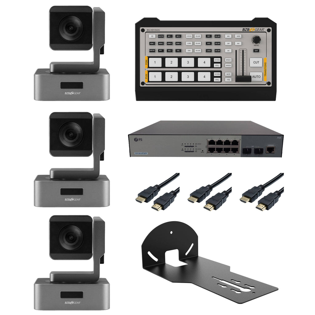 Set up a compact podcast environment in your classroom, meeting room, or house of worship with this Podcast Kit with 3 x 30x PTZ Cameras/Mixer/PoE Switch/Wall Mount/Cable from BZBGear. The kit includes three gray 1080p HDMI/SDI/USB 3.0 PTZ cameras with 30x optical zoom, a 4-channel live streaming video switcher/audio mixer, an 8-port 1G Ethernet PoE+ switch with eight PoE+ ports and two 1Gb SFP uplinks, three PTZ camera wall mounts, and three 50' long high-speed HDMI cables.