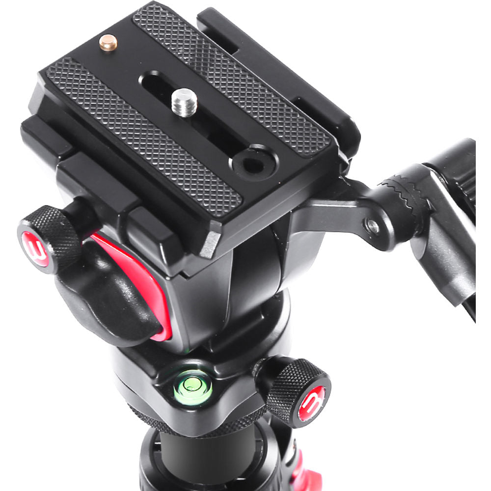 The head offers 360° locking pan rotation, a padded pan/tilt handle, a sliding quick release plate, an easy-to-read bubble level, and a center-column knob that can fine-tune your tripod head's position. There is a grip on one of the legs that provides a solid grip when moving and carrying the rig. The rubber feet keep your tripod steady on a variety of surfaces.