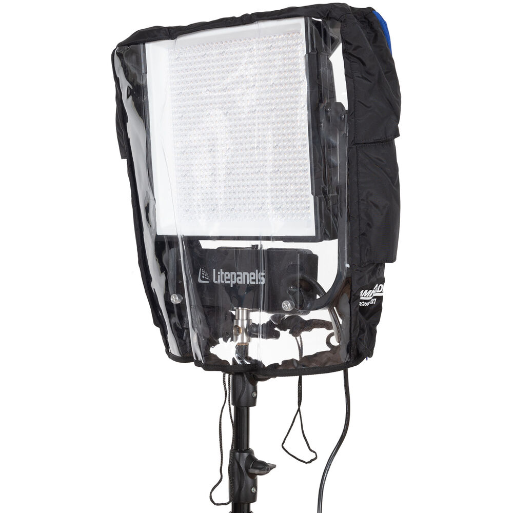 There are vents to reduce the risk of the panel overheating by allowing hot air to escape and the cover prevents water from reaching the battery, the control unit, or AC/DC adapter. The high-density shock cord on the bottom allows you to fasten the cover to a lighting stand or other mount. The length of the cover prevents water from getting to the panel through the bottom. A waterproof, zippered pouch in included for storage and transport of the cover when you aren't using it.