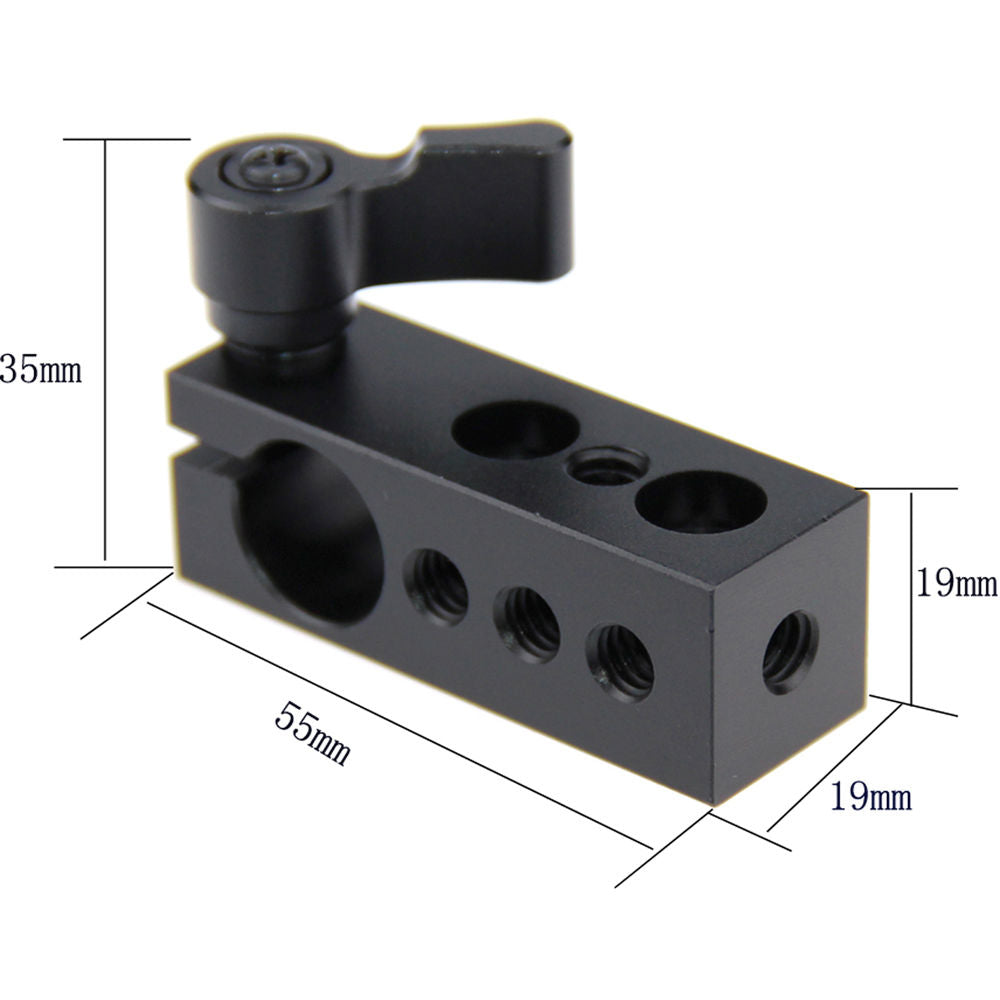 This 15mm Rod Clamp with Multiple 1/4"-20 Threads with black locking lever from CAMVATE has a single rod port which is compatible with standard 15mm rod systems. The aluminum clamp features multiple 1/4"-20 threaded mounting holes on each side to add accessories such as monitors, lights, or other gear to your 15mm rods, and a threaded 1/4"-20 screw adapter hole is provided. Two 1/4"-20 mounting screws and an Allen wrench are included.