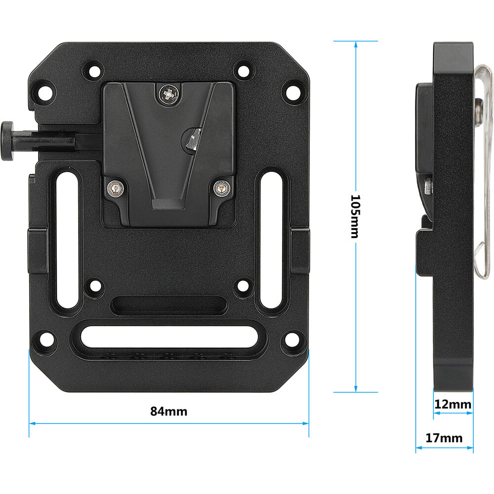 This V-Mount Quick Release Plate with VESA Mount and Belt Clip from CAMVATE offers the option to mount your V-mount battery on your shoulder rig or belt with its 75 x 75mm VESA mounting holes and belt clip. This allows you to transition from hands-free carrying to powering your camera with the push of a lever.