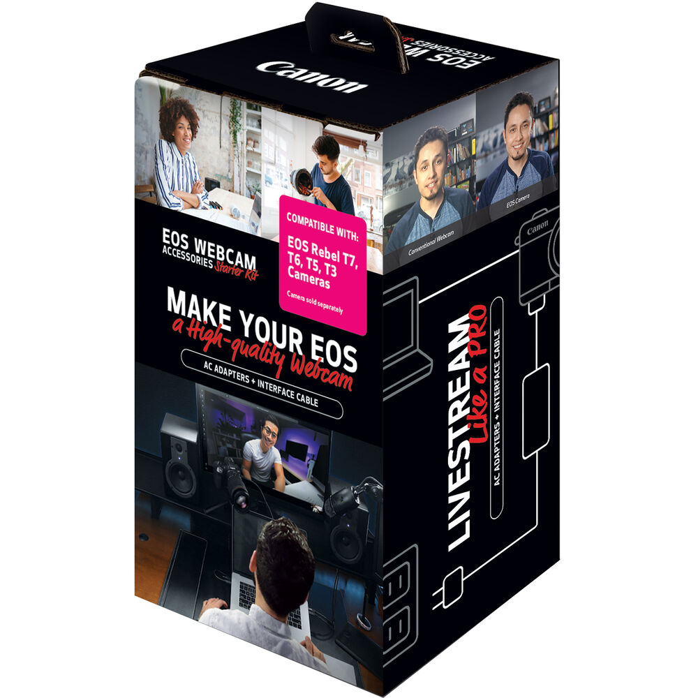 Designed for the EOS Rebel T3, T5, T6 & T7 DSLR Cameras, the EOS Webcam Accessories Starter Kit from Canon lets you to turn your high-resolution digital camera into a high-performance webcam. Simply download the freely available EOS Webcam Utility software, connect the camera to a compatible laptop or desktop computer with the provided IFC-400PCU Interface Cable, power it with the included CA-PS700 AC Adapter and the supplied DR-E10 DC Coupler using a standard home outlet, and you'll be on your way to longer continuous shooting and outstanding clarity. Whether you're working, teaching, livestreaming, or just reaching out to friends and family, your audience will be able to clearly see you. This kit gives you everything you need in one convenient package, and lets you put yourself out there with the quality and ease you desire.