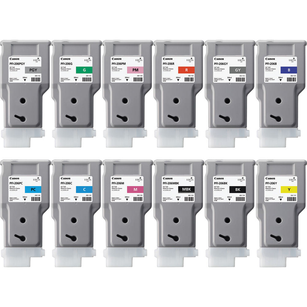 The PFI-206 12-Color Ink Kit imagePROGRAF iPF6400 and iPF6450 Printers is a B&H Kit that includes the following 300 ml ink tanks: