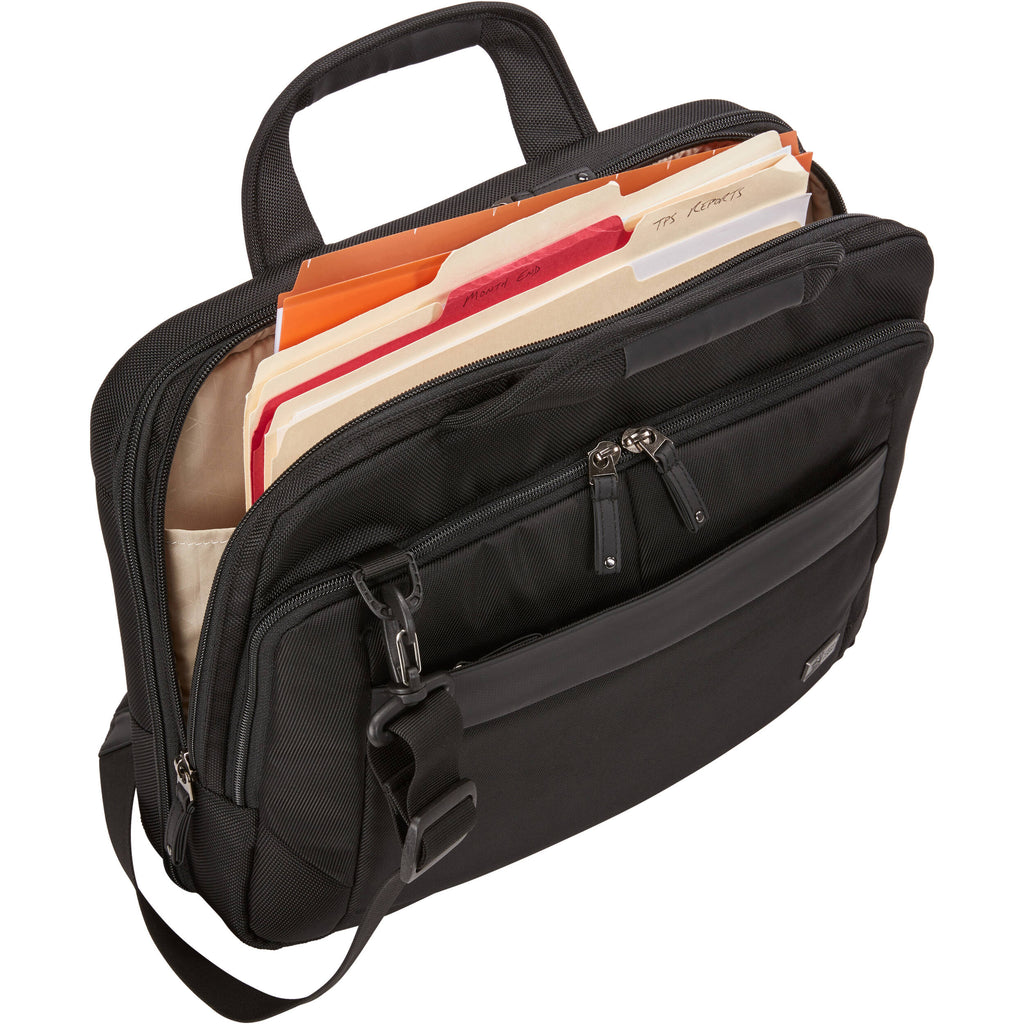 The black Case Logic Notion 14" TSA Laptop Bag protects your laptop with dual-density Impact Foam protection. Store a 14" laptop in the dedicated compartment padded with EVA Impact Foam for extra protection. Keep a tablet, files, or papers separate in the structured slip pocket. The padded organization panel provides multiple storage options for small electronics, cables, accessories, business cards, and keys.