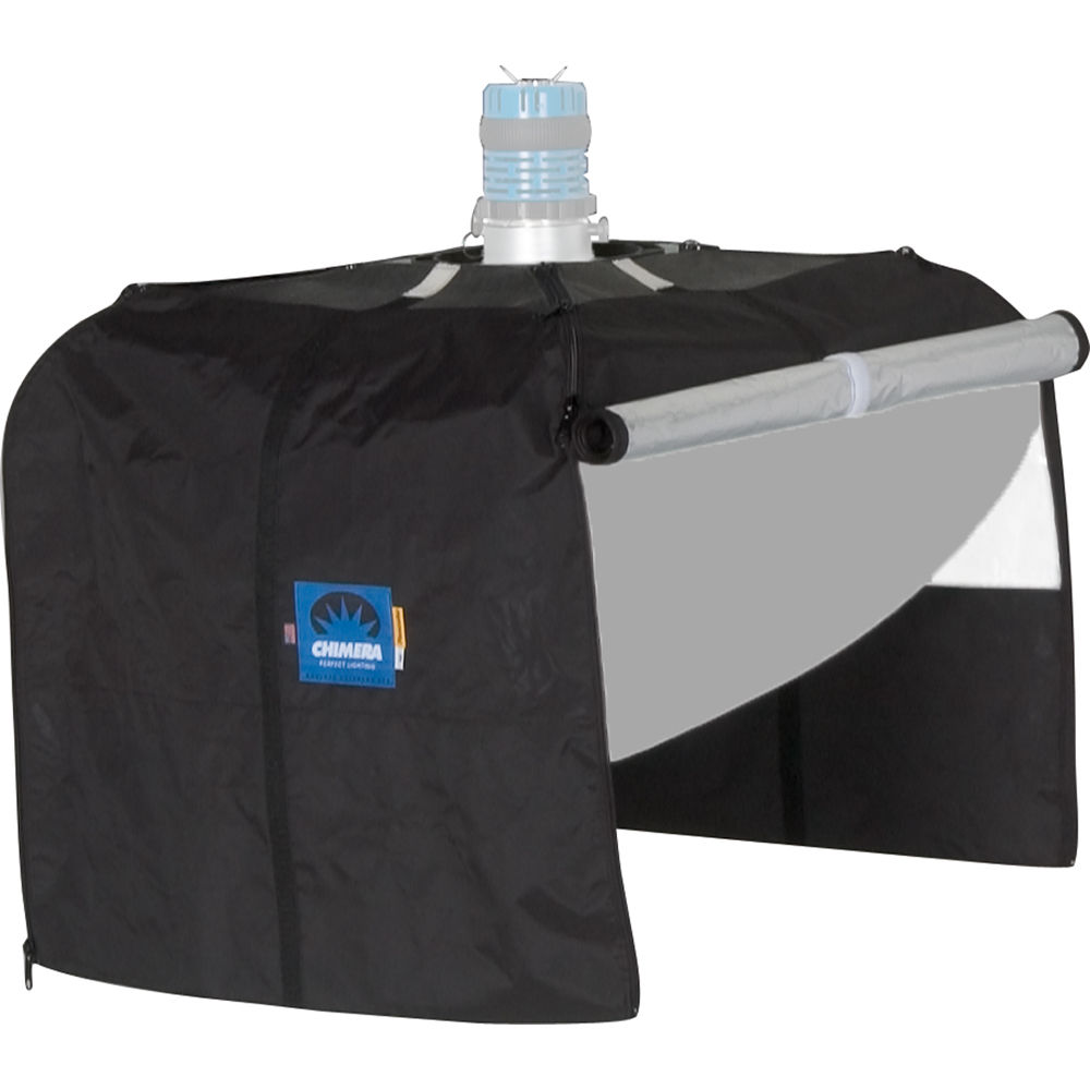 This Skirt transforms a Small (21") Chimera Lantern Pancake softbox into a masked softbox with silver interior panels and a black drop-down skirt. The black lined silver panels confine and intensify the soft lantern light output onto a very small product setup or a portrait. The skirt height is adjustable to further control (or gobo) the placement of the light pool.