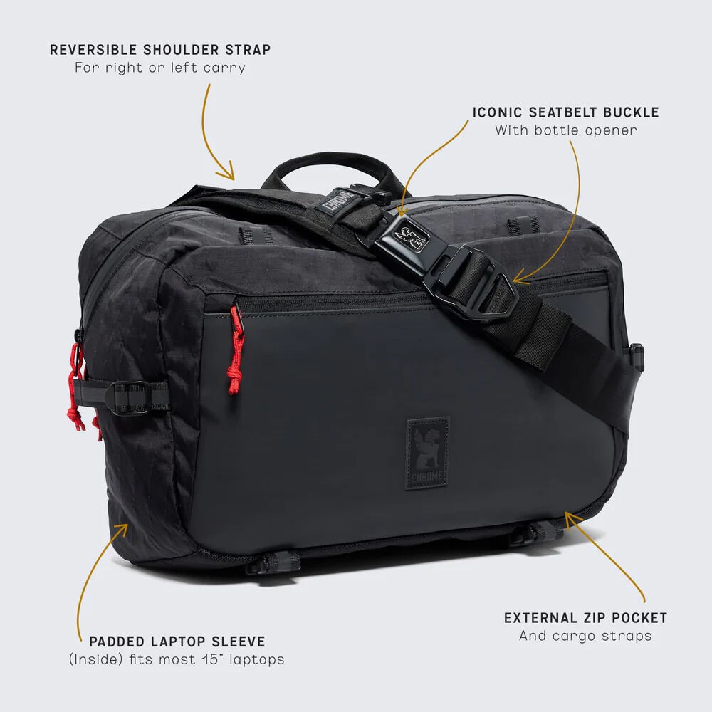 The Chrome Industries Kadet Max is a versatile 15L bag for everyday carry. Wear the Max over your shoulder or cross-body style using the 38.5 to 55.5" adjustable strap. The strap has Chrome's iconic seatbelt buckle release with an integrated bottle opener so you can get the party started when your workday is done.