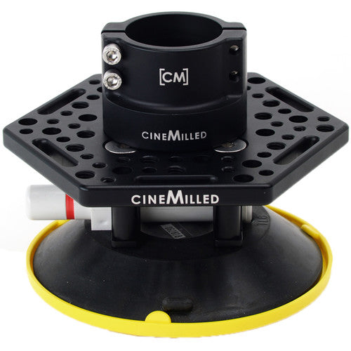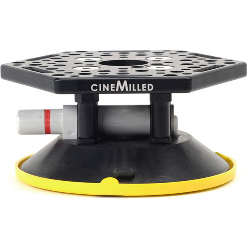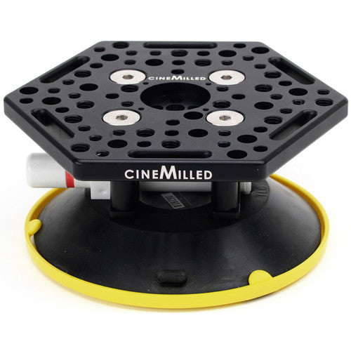 The large 6" Rigging Suction Cup from CineMilled provides a durable hold for your gear when mounting it on a vehicle such as a car. It features a cheese plate on top with 1/4"-20 and 3/8"-16 threads, and it also features through holes and ratchet safety strap slots around the plate. It is compatible with all CineMilled universal gimbal mounts, Houdini speedrail clamps, and "grenades", as well as with third-party fluid heads and other mounting gear.