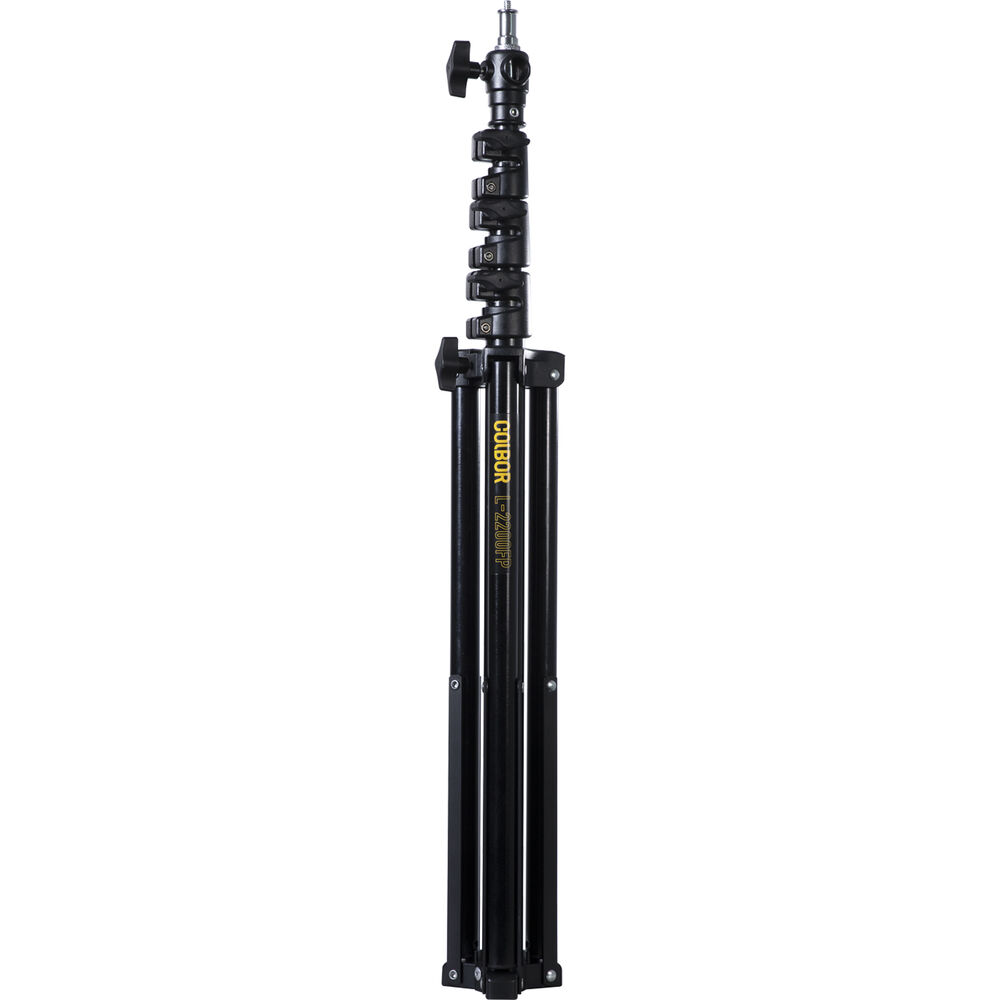 This 7.2' 2200FP Air-Cushioned Light Stand from COLBOR is a standard general-purpose light stand coated in black. The stand extends to 7.2' to easily support up to 6.6 lb. It has a minimum working height of 2.5' and folds down to 2.2' for storage and portability. The stand is topped with a removable spigot with 1/4"-20 and 3/8"-16 threads to give you wide compatibility with gear and accessories.