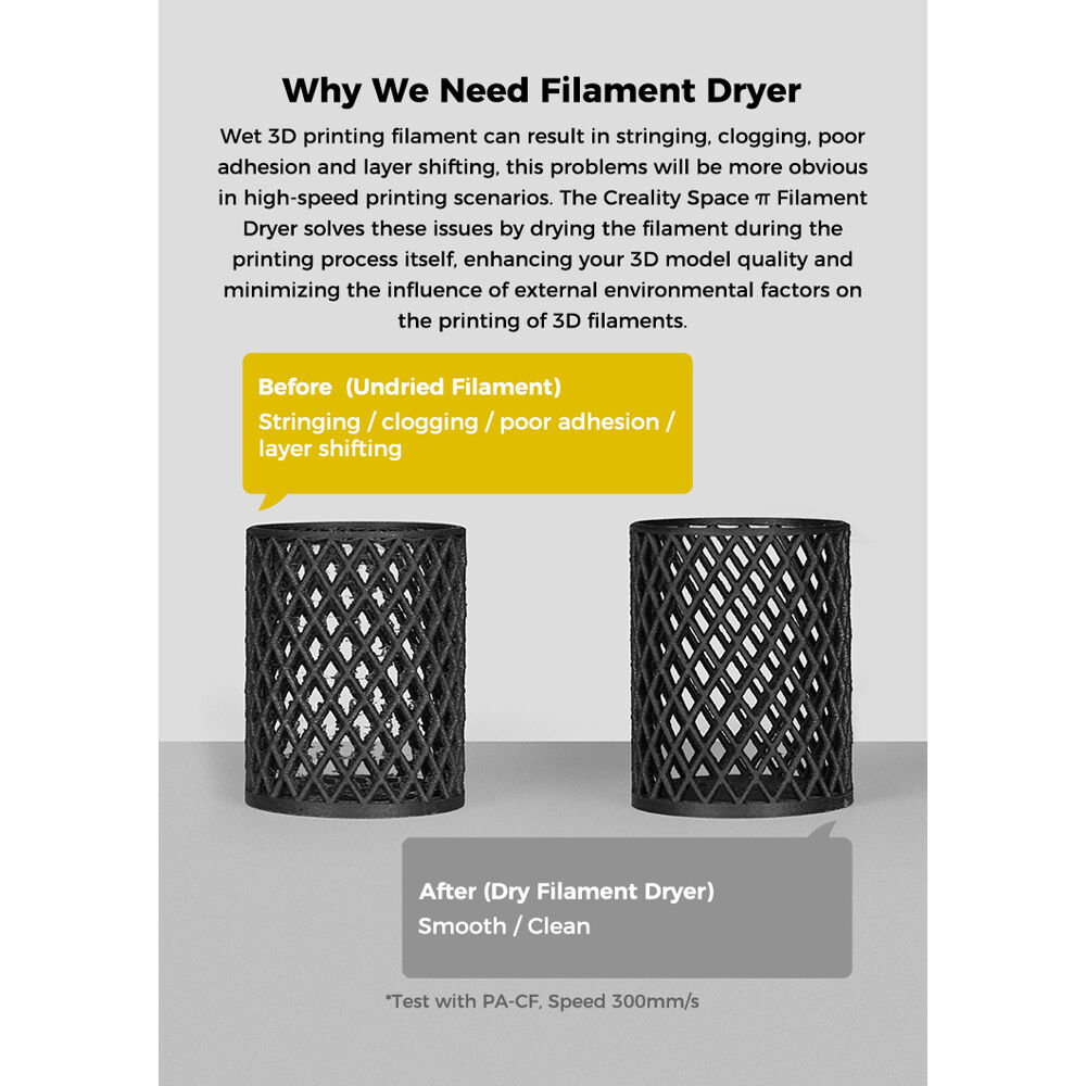 Seasoned creators can keep their filament dry and ready for printing with the Creality Space Pi Filament Dryer. Featuring an enclosed chamber that can store a single spool of material, the Space Pi reduces humidity and keeps the filament dry which reduces stringing, clogging, layer shifting, and more.
